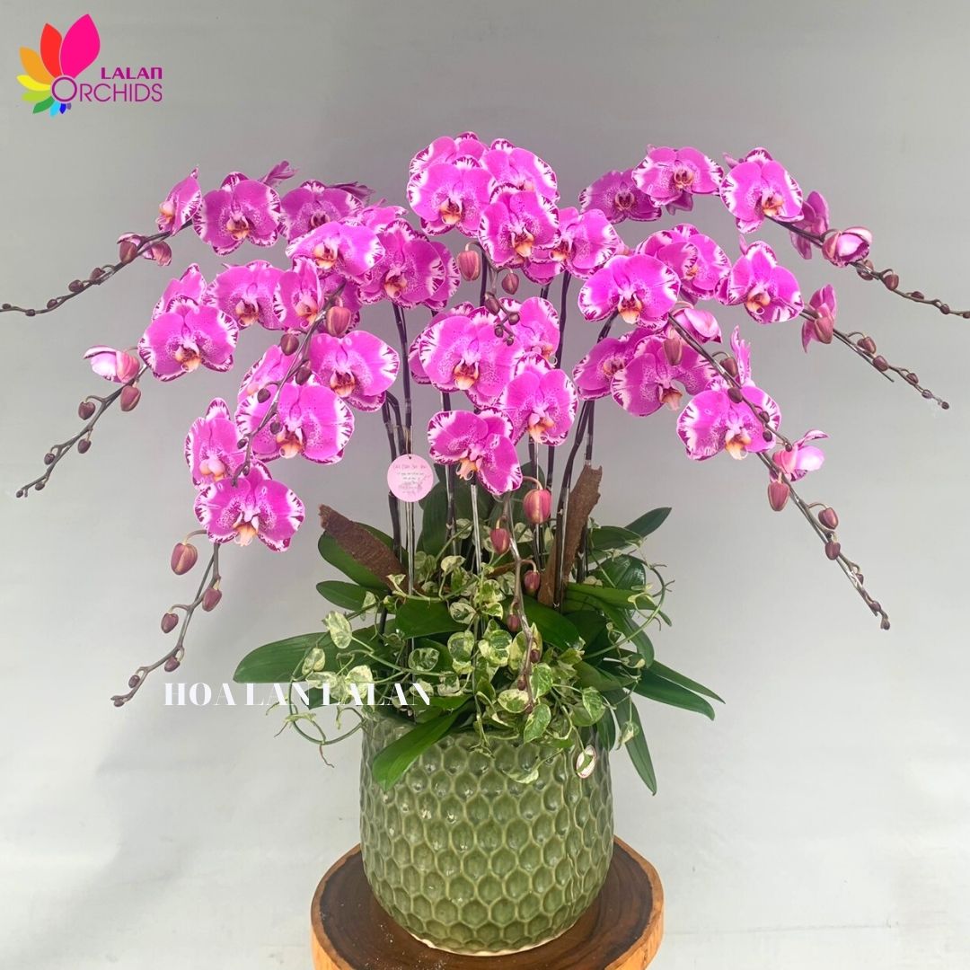Chậu hoa lan hồ điệp màu hồng đột biến 10 cành ghép từ những cành hoa lan chất lượng loại A với đặc điểm bông to, cành dài, siêu bền, được các nghệ nhân của Hoa lan Lalan ghép xen kẽ một cách hài hòa, nghệ thuật tạo nên chậu hoa lan đẹp sang trọng, quý phái và tinh tế.