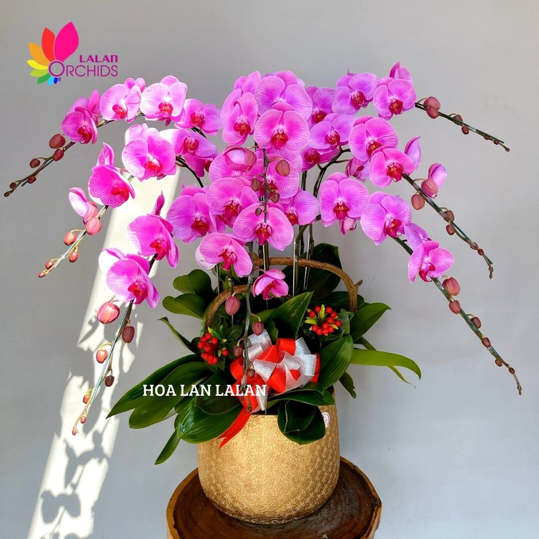 Chậu hoa lan hồ điệp màu hồng 9 cành ghép từ những cành lan chất lượng loại A với đặc điểm bông to, cành dài, siêu bền, được các nghệ nhân của Hoa lan Lalan ghép xen kẽ một cách hài hòa, nghệ thuật tạo nên chậu hoa lan đẹp sang trọng, quý phái và tinh tế.