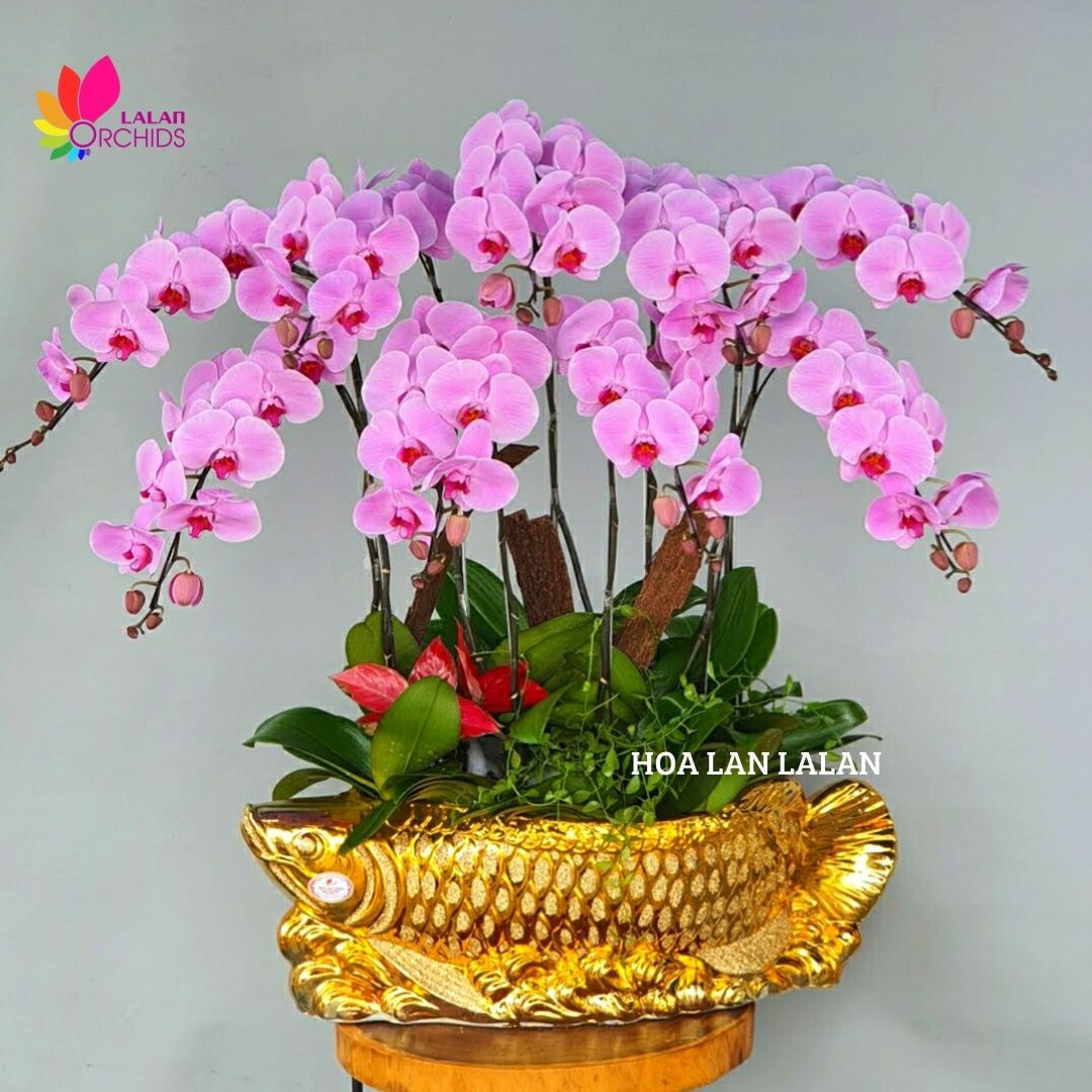 Lan hồ điệp cá vàng ghép từ những cành hoa lan chất lượng loại A với đặc điểm bông to, cành dài, siêu bền, được các nghệ nhân của Hoa lan Lalan ghép xen kẽ một cách hài hòa, nghệ thuật tạo nên chậu hoa lan đẹp sang trọng, quý phái và tinh tế.