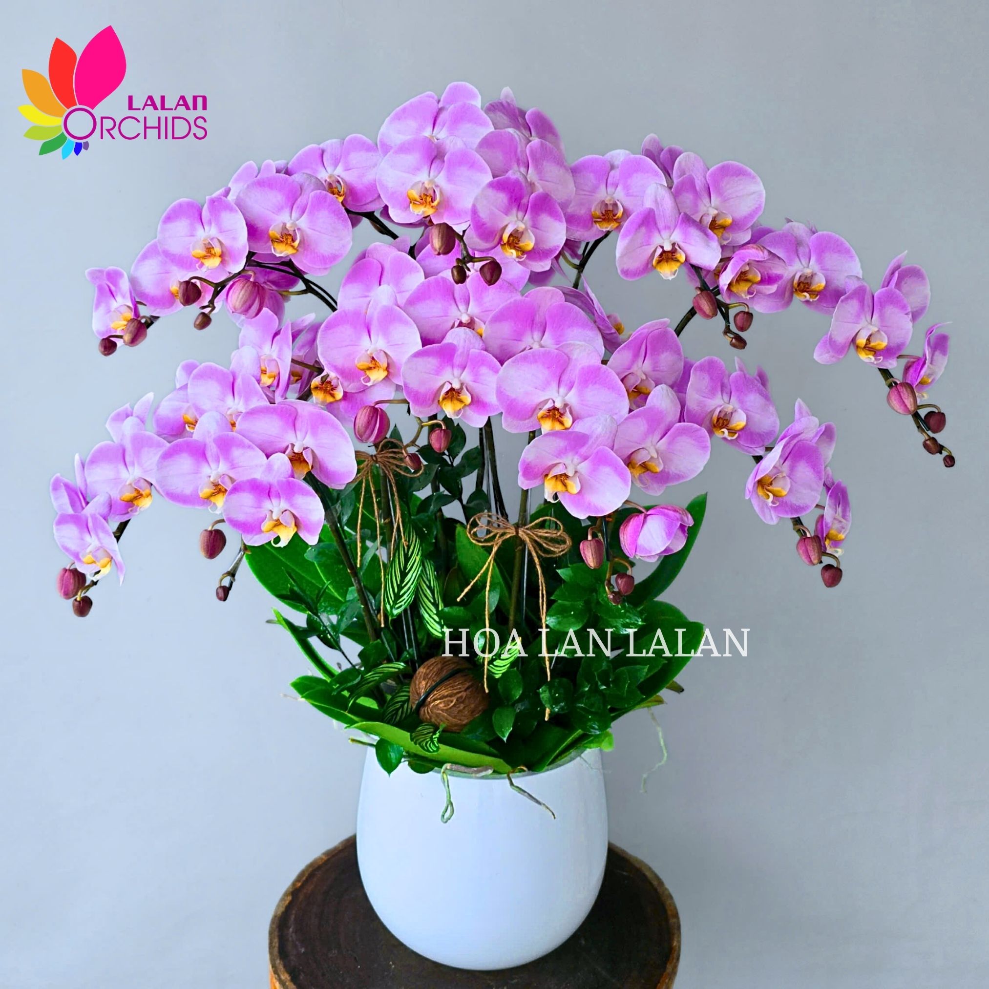 Với kích thước vừa phải và kiểu dáng thanh lịch, những đóa lan hồ điệp nở rộ xếp đều đặn tạo nên sự cân đối và trang nhã. Chậu hoa lan hồ điệp này mang lại cảm giác tươi mới, thanh thoát cho bất kỳ không gian nào từ phòng khách, văn phòng cho đến sảnh lễ tân.