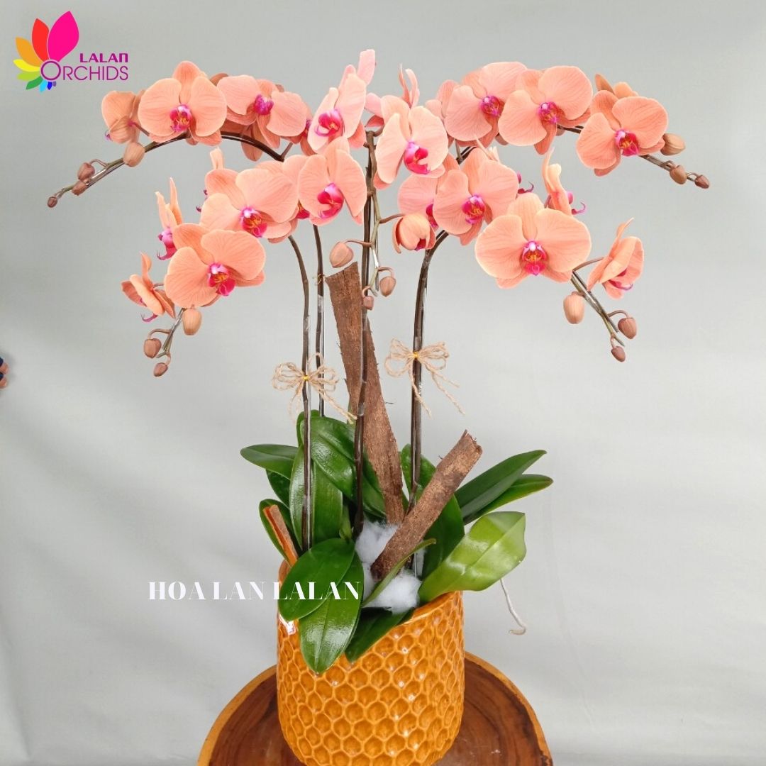 Lan hồ điệp màu cam 5 cành được ghép từ những cành hoa lan chất lượng loại A với đặc điểm bông to, cành dài, siêu bền, được các nghệ nhân của Hoa lan Lalan ghép xen kẽ một cách hài hòa, nghệ thuật tạo nên chậu hoa lan đẹp sang trọng, quý phái và tinh tế.
