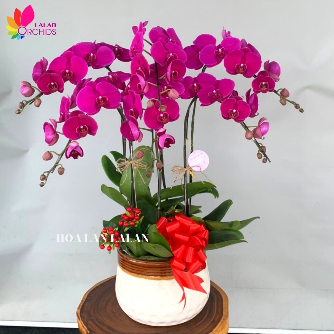 Chậu hoa lan hồ điệp màu tím 6 cành ghép từ những cành hoa lan chất lượng loại A với đặc điểm bông to, cành dài, siêu bền, được các nghệ nhân của Hoa lan Lalan ghép xen kẽ một cách hài hòa, nghệ thuật tạo nên chậu hoa lan đẹp sang trọng, quý phái và tinh tế.