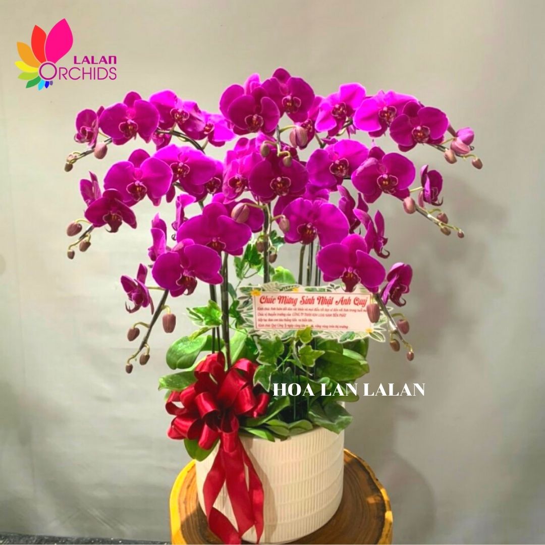 Chậu hoa lan hồ điệp màu tím 8 cành kết hợp từ 8 gốc cùng với chậu sứ và nơ trang trí, được những người thợ có tay nghề cao của Hoa lan Lalan thiết kế một cách tỉ mỉ và nghệ thuật, tạo nên chậu lan hồ điệp sang trọng, quyến rũ và tinh tế.