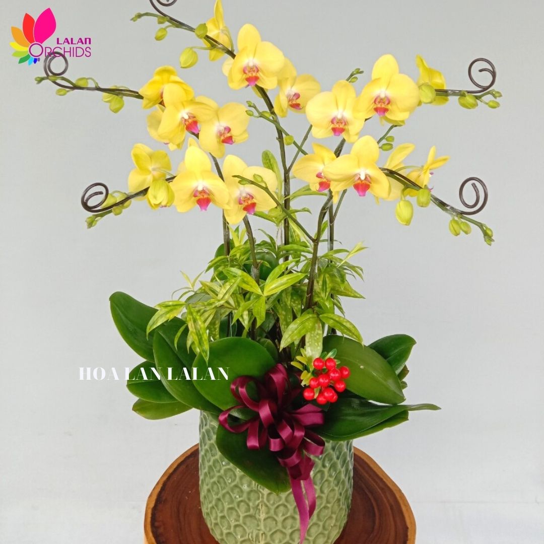 Chậu hoa lan hồ điệp màu vàng 5 cành đẹp sang trọng ghép từ những cành hoa lan chất lượng loại A với đặc điểm bông to, cành dài, siêu bền, được các nghệ nhân của Hoa lan Lalan ghép xen kẽ một cách hài hòa, nghệ thuật tạo nên chậu hoa lan đẹp sang trọng, quý phái và tinh tế.