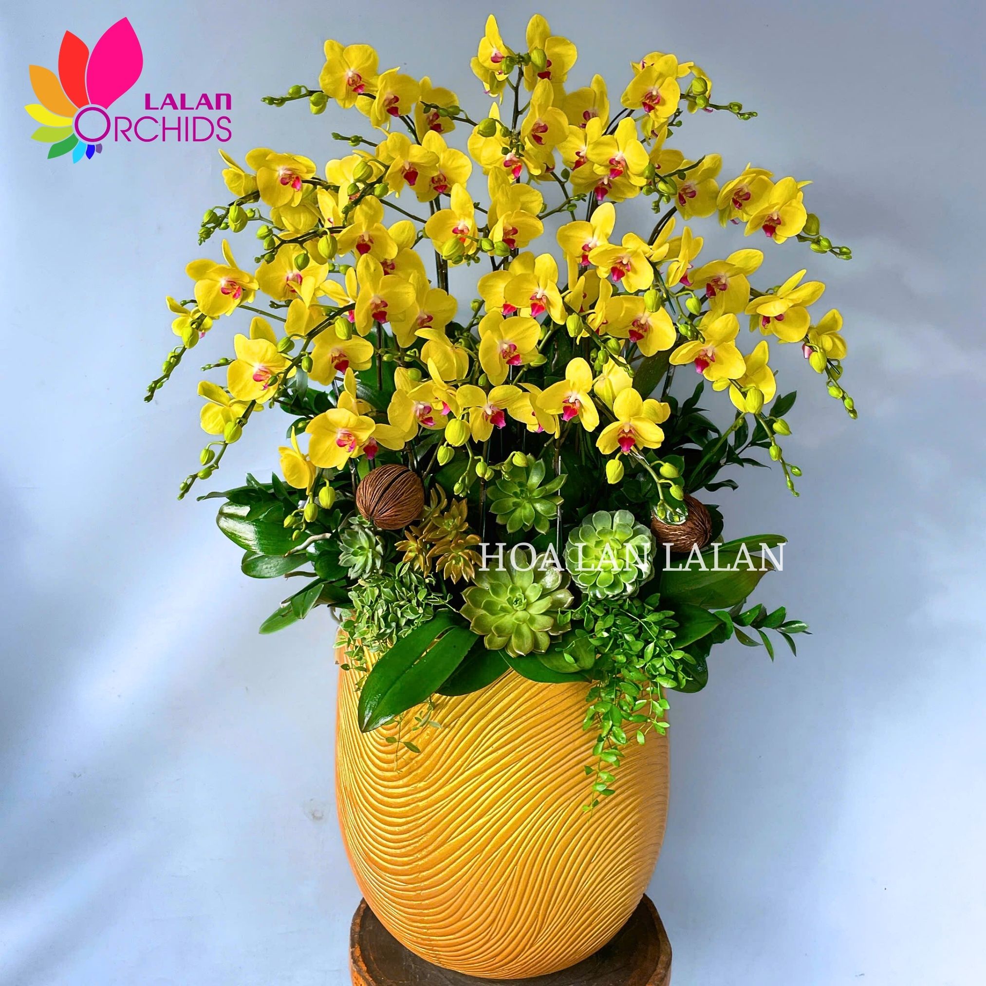 Nổi tiếng với vẻ đẹp thanh thoát và sang trọng, lan hồ điệp vàng được ưu ái lựa chọn làm quà tặng và vật phẩm trang trí không gian sống và làm việc. Chậu hoa lan hồ điệp màu vàng tươi 20 cành nở nên nổi bật và thu hút ở mọi không gian trưng bày. Mỗi cánh lan hồ điệp vàng như tia nắng, mang lại nguồn năng lượng dồi dào và sức sống mãnh liệt cho không gian.