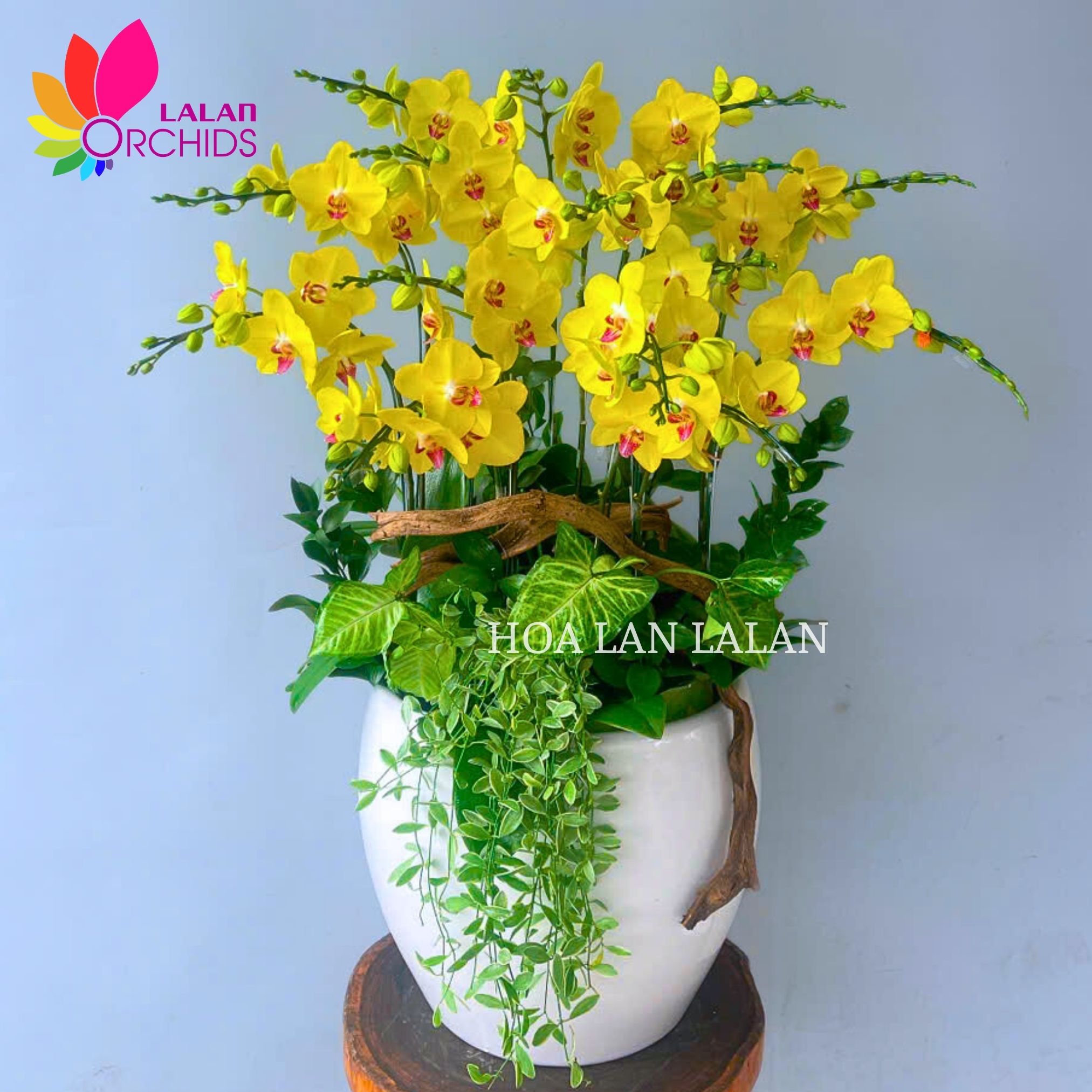 Chậu hoa lan hồ điệp vàng tươi có thiết kế tinh tế, thích hợp đặt ở nhiều vị trí khác nhau như bàn làm việc, phòng khách, hay không gian nhà riêng, mang đến vẻ đẹp tự nhiên và sang trọng. Không gian trở nên bừng sáng và ấm áp hơn với sắc vàng tươi của những đóa lan hồ điệp rực rỡ.