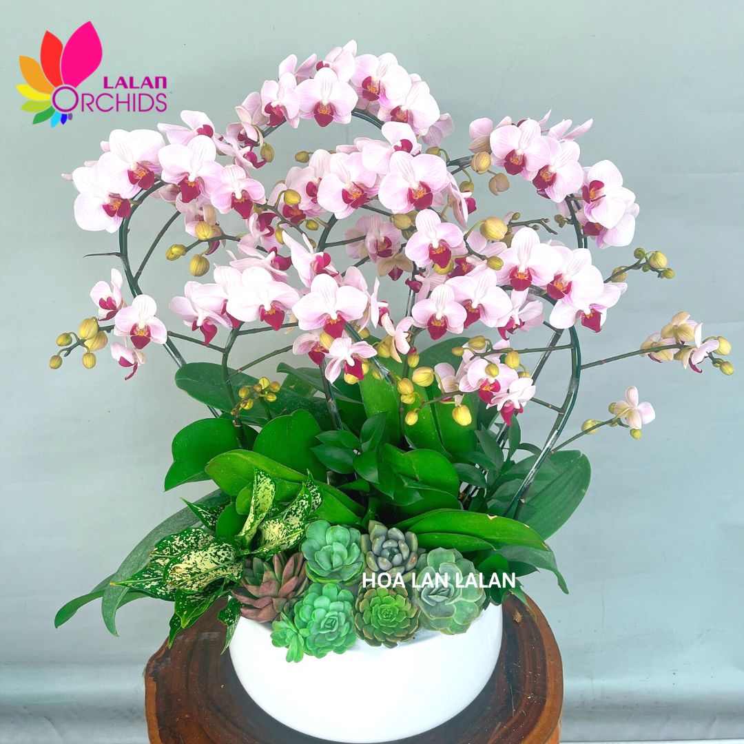 Lan hồ điệp mini 6 cành ghép được các nghệ nhân của Hoa lan Lalan ghép xen kẽ kết hợp cùng cây sen đá một cách hài hòa, nghệ thuật tạo nên chậu hoa lan đẹp sang trọng, quý phái và tinh tế.