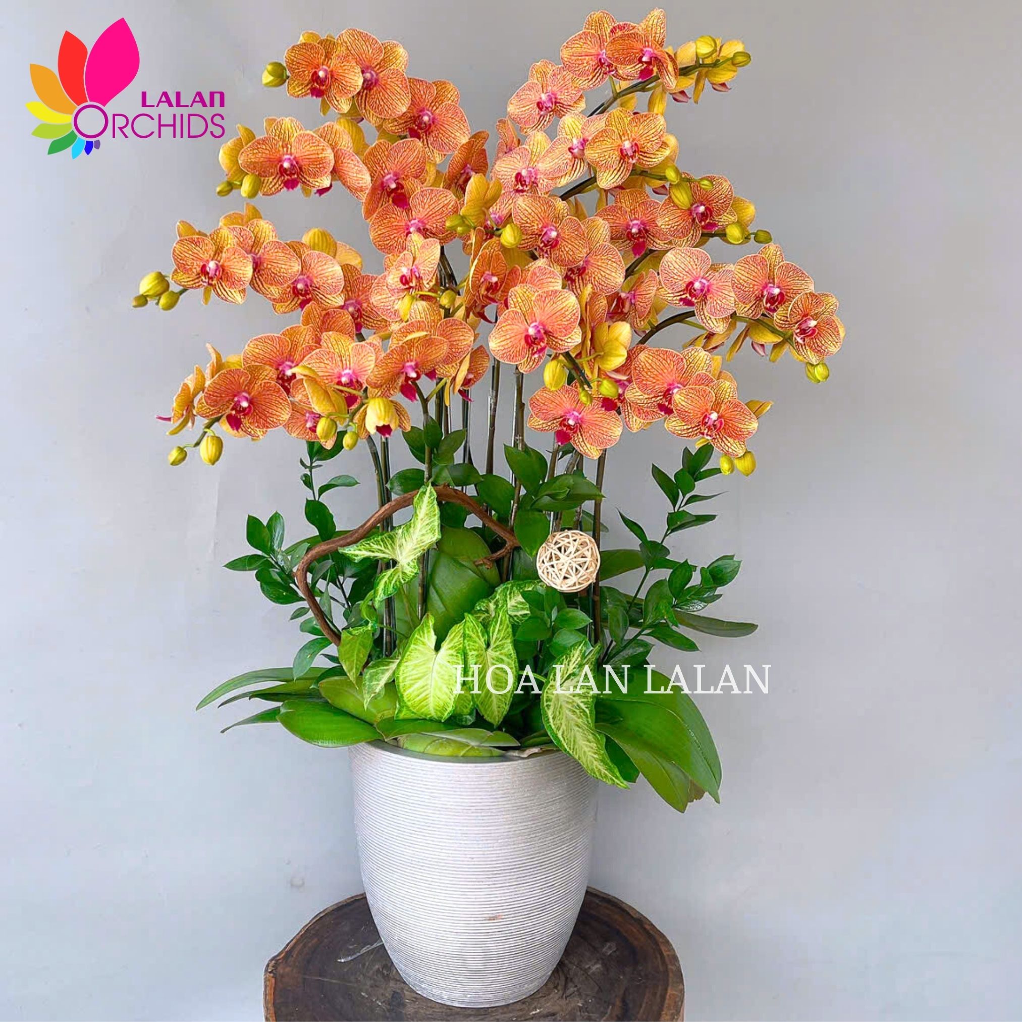 Chậu hoa lan hồ điệp cam sọc tạo ấn tượng mạnh mẽ với sắc cam rực rỡ, xen lẫn những đường vân sọc độc đáo, tượng trưng cho sự sáng tạo, khéo léo và đột phá. Cánh hoa lan hồ điệp mềm mại, thướt tha, sự sắp xếp khéo léo từng cành hoa tạo nên một tổng thể hài hòa, sang trọng.