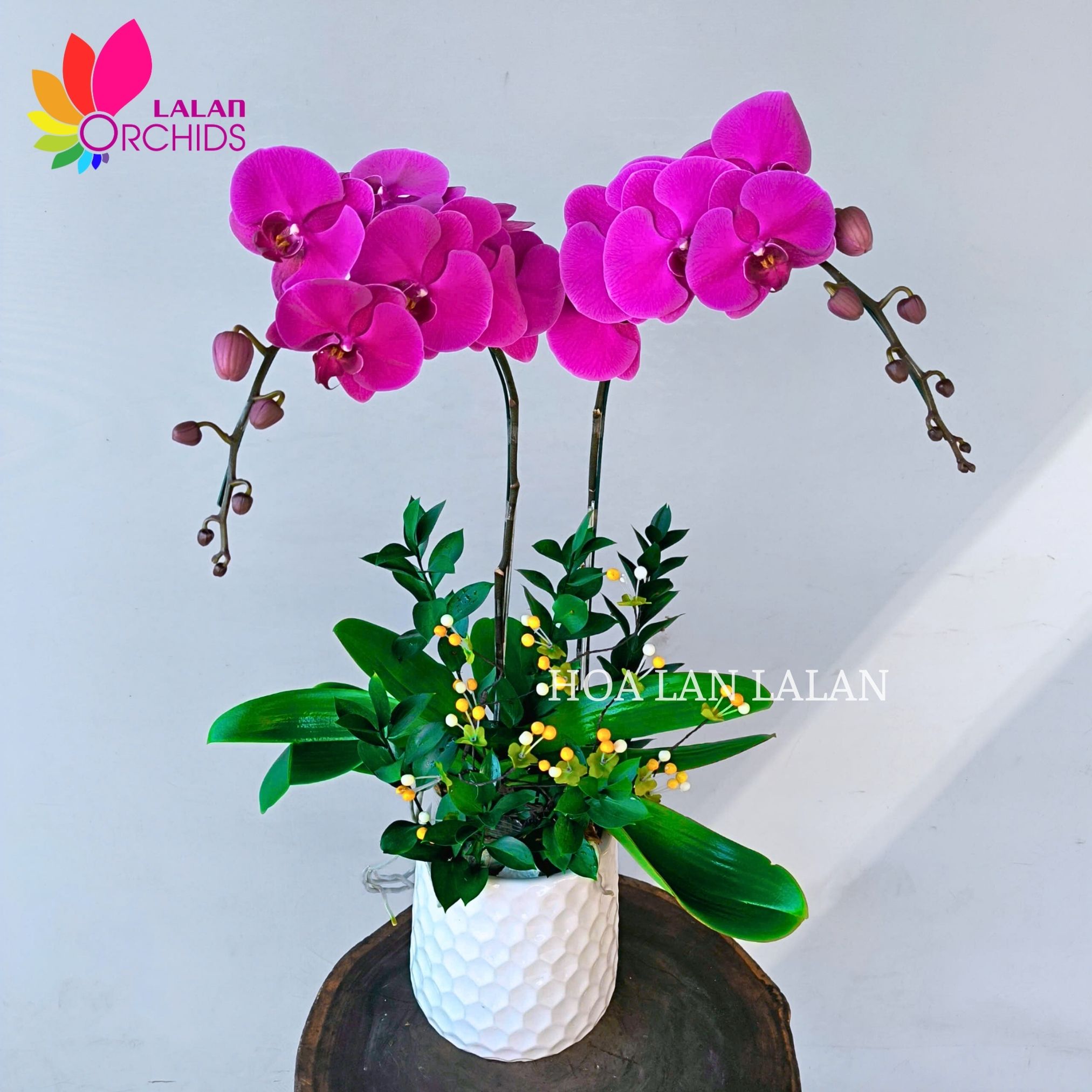 Lan hồ điệp tím từ lâu đã được biết đến là biểu tượng của sự quý phái và sang trọng, mang trong mình những giá trị phong thủy tốt lành. Với sắc tím quý phái, chậu hoa lan hồ điệp tím 2 cành nổi bật với tính thẩm mỹ cao, vẻ đẹp thanh lịch cùng sự dịu dàng và uyển chuyển của cành lan hồ điệp. Chậu hoa lan hồ điệp với hai cành lan hồ điệp tím khỏe khoắn, kiêu sa, bông to bung nở đều, đươc tạo dáng để tôn lên triệt để sự kiêu kì của lan hồ điệp.