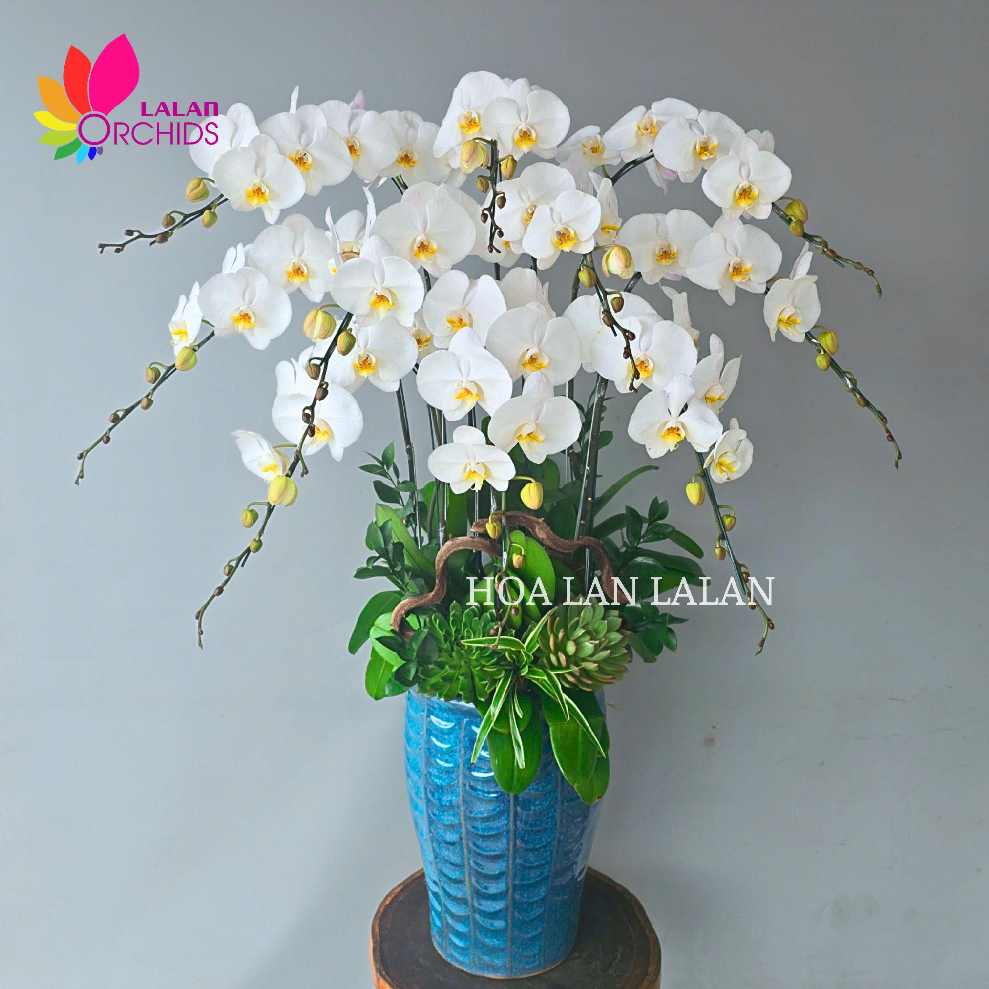 Hoa lan hồ điệp trắng tượng trưng cho sự thanh cao, thuần khiết và hoàn mỹ. Được thiết kế tỉ mỉ từ những cánh hoa trắng tinh khôi, thanh khiết, chậu hoa lan hồ điệp trắng 10 cành sang trọng, thanh cao và quý phái. Chậu hoa lan hồ điệp gồm 10 cành được sắp xếp cân đối, tạo cảm giác hài hòa và dễ chịu cho bất kỳ nơi nào nó hiện diện.