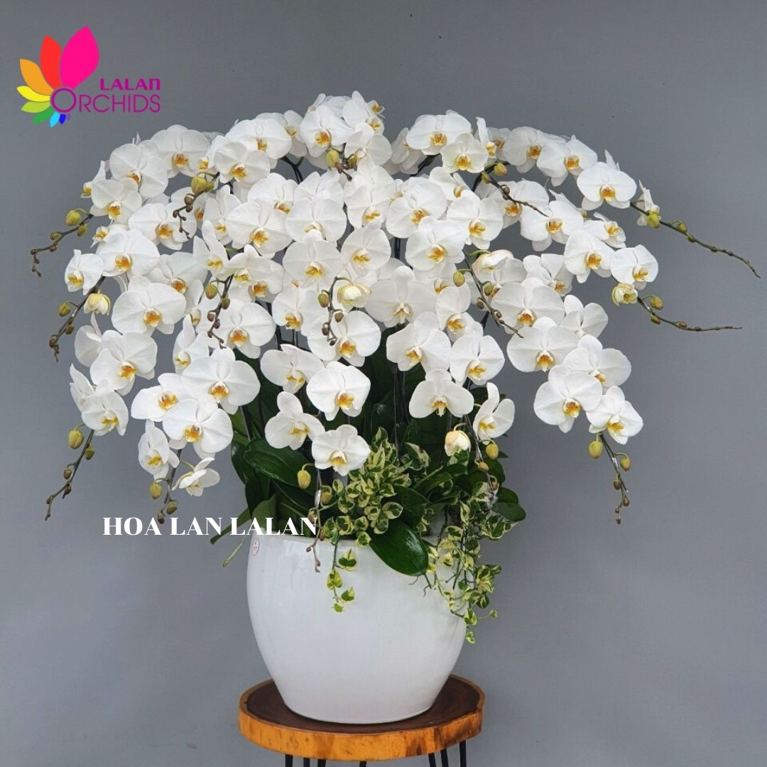 Chậu hoa lan hồ điệp màu trắng 15 cành kết hợp từ 15 gốc lan hồ điệp trắng, được những người thợ có tay nghề cao của Hoa lan Lalan thiết kế một cách tỉ mỉ và nghệ thuật, tạo nên chậu lan hồ điệp sang trọng, quyến rũ và tinh tế.