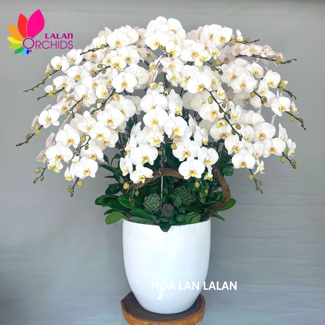 Lan hồ điệp trắng được kết hợp từ 25 cành lan do các nghệ nhân của Hoa lan LaLan ghép, tạo nên tác phẩm đẹp và sang trọng, thu hút mọi ánh nhìn.