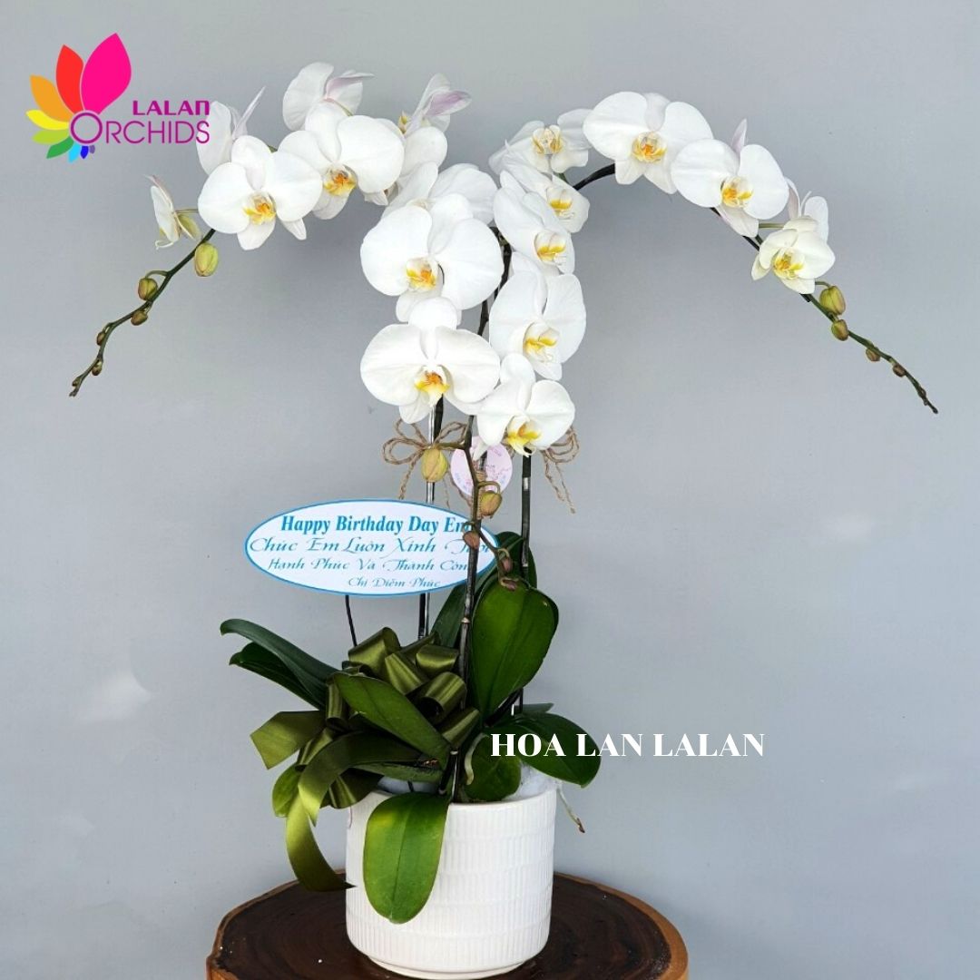 Chậu hoa lan hồ điệp màu trắng 3 cành kết hợp từ 3 gốc lan hồ điệp trắng, được những người thợ có tay nghề cao của Hoa lan Lalan thiết kế một cách tỉ mỉ và nghệ thuật, tạo nên chậu hoa lan hồ điệp sang trọng, quyến rũ và tinh tế.