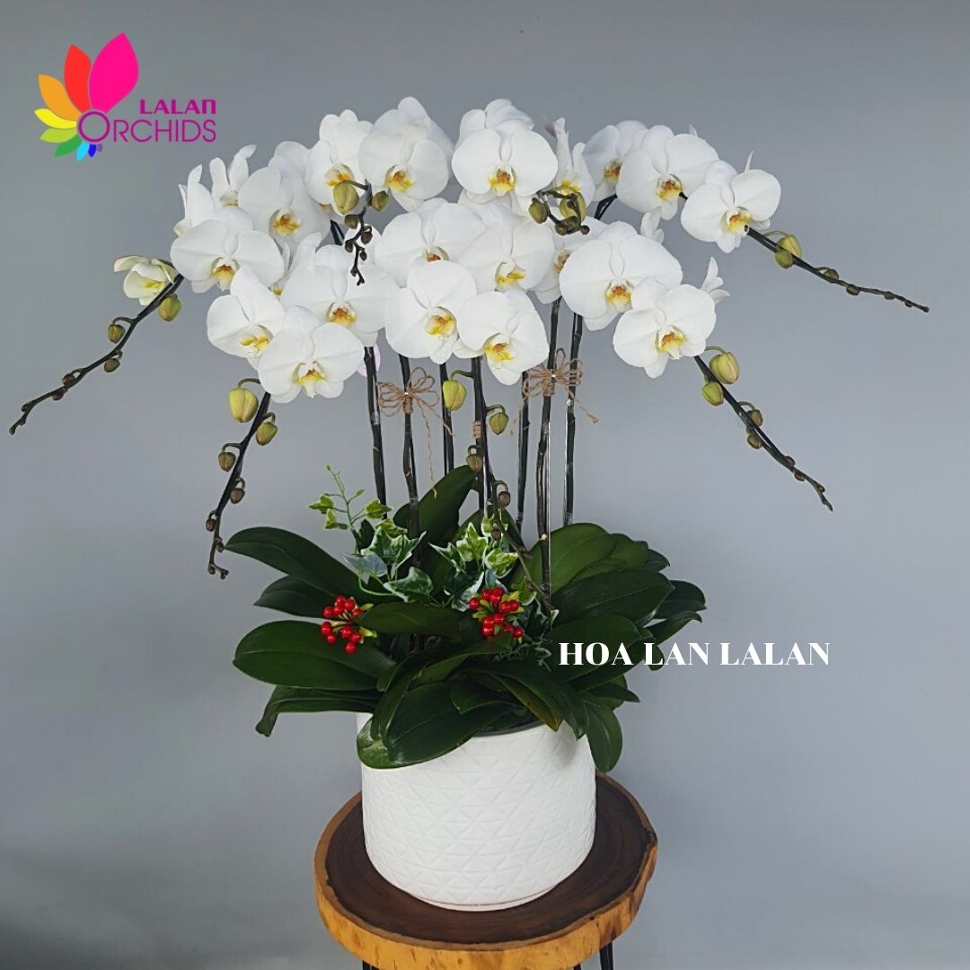 Chậu hoa lan hồ điệp trắng biểu tượng cho sự tinh khiết, trong sáng, thánh thiện và trinh nguyên. Chậu hoa lan hồ điệp màu trắng 7 cành được các nghệ nhân của Hoa lan Lalan cắm xen kẽ một cách hài hòa mang lại một vẻ đẹp khó tả.