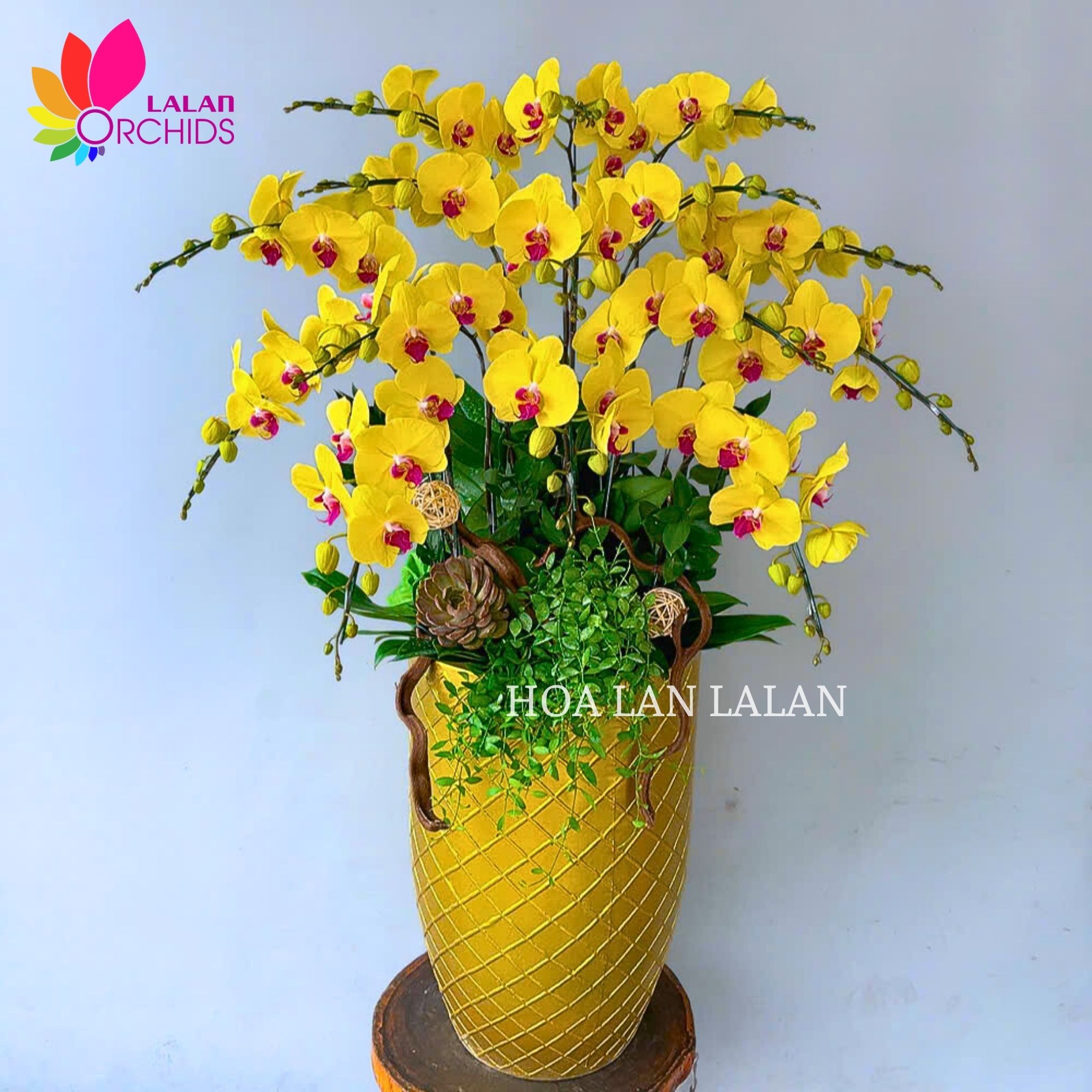 Với 15 cành hoa lan hồ điệp vàng rực rỡ, khỏe khoắn, bông nở to và đều tạo nên một chậu lan hồ điệp tươi tắn, đẹp mắt và sang trọng. Màu vàng rực rỡ của những bông lan hồ điệp tượng trưng cho sự giàu sang và phú quý. Mỗi cánh hoa mềm mại, uyển chuyển như biểu tượng của sự trường tồn và tinh tế, chậu hoa lan hồ điệp khiến không gian trở nên sang trọng và quý phái.