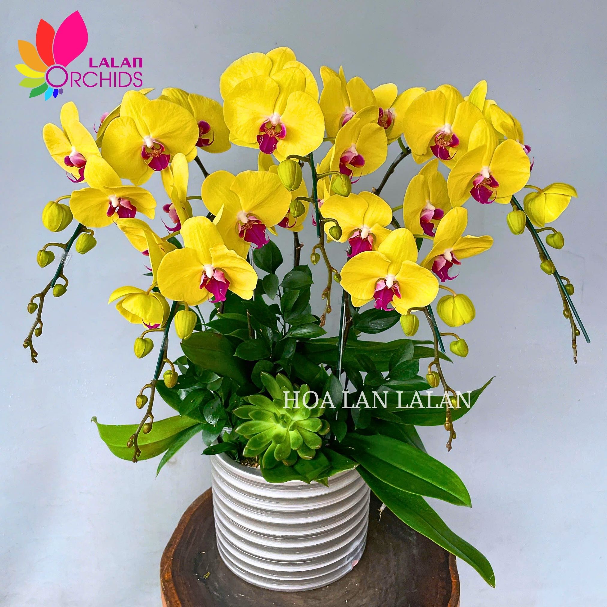 Chậu hoa lan hồ điệp vàng 5 cành mang đến vẻ đẹp tươi sáng, sang trọng, thu hút mọi ánh nhìn. Màu vàng của lan hồ điệp không chỉ là biểu tượng của sự giàu sang, thịnh vượng mà còn mang ý nghĩa phong thủy tích cực, giúp gia chủ thu hút tài lộc và may mắn.