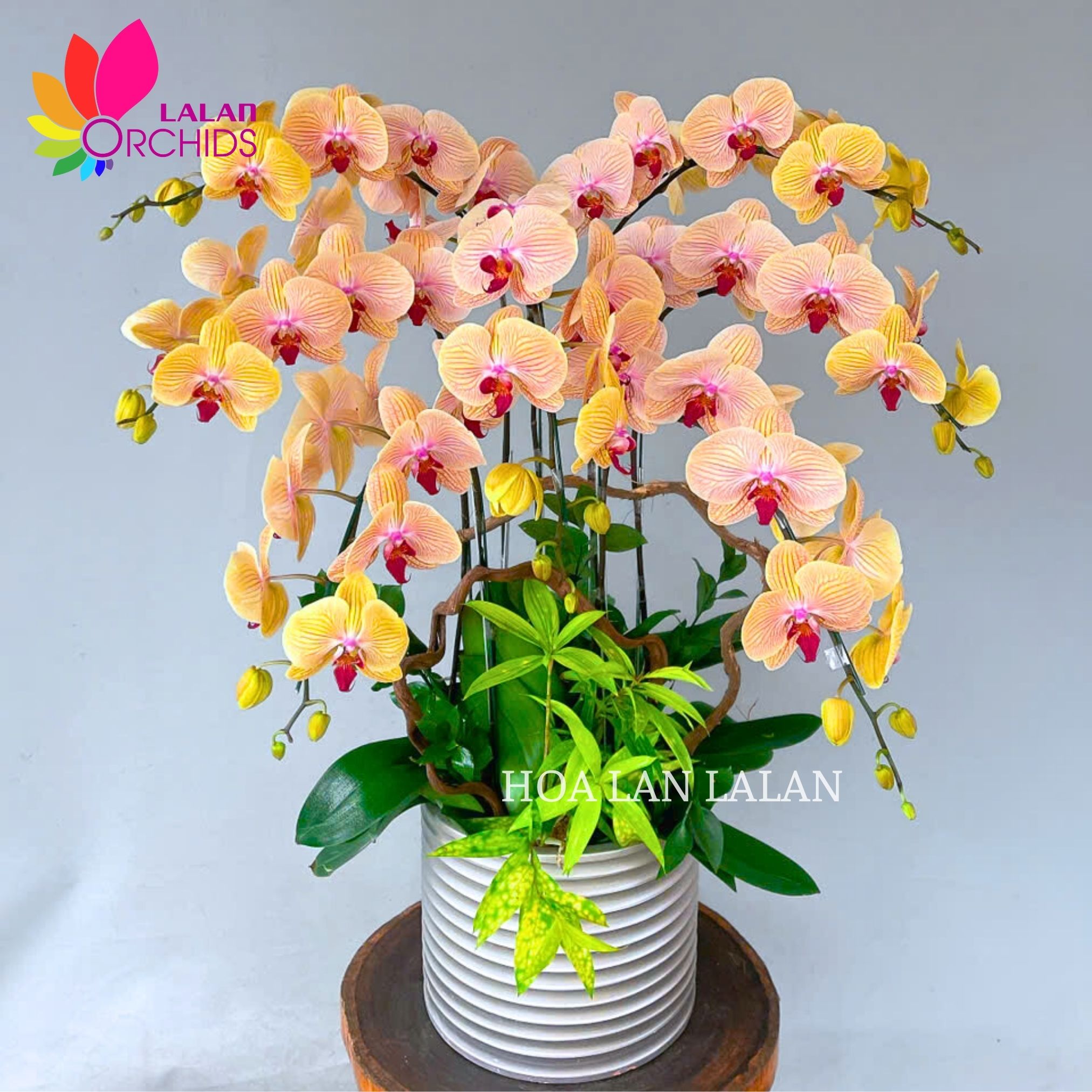 Chậu hoa lan hồ điệp vàng cam sọc toát lên sự nổi bật với những cánh hoa mềm mại, rực rỡ pha lẫn sắc vàng ấm áp và sắc cam tinh tế. Các đường sọc nổi bật trên nền hoa không chỉ tạo nên sự khác biệt mà còn khiến mỗi bông lan hồ điệp trở nên đặc biệt và thu hút hơn. Sự kết hợp hài hòa giữa hai tông màu này đại diện cho niềm vui, năng lượng và sự thành công, chậu hoa lan hồ điệp vàng cam sọc trở thành biểu tượng của sự phát triển và may mắn.