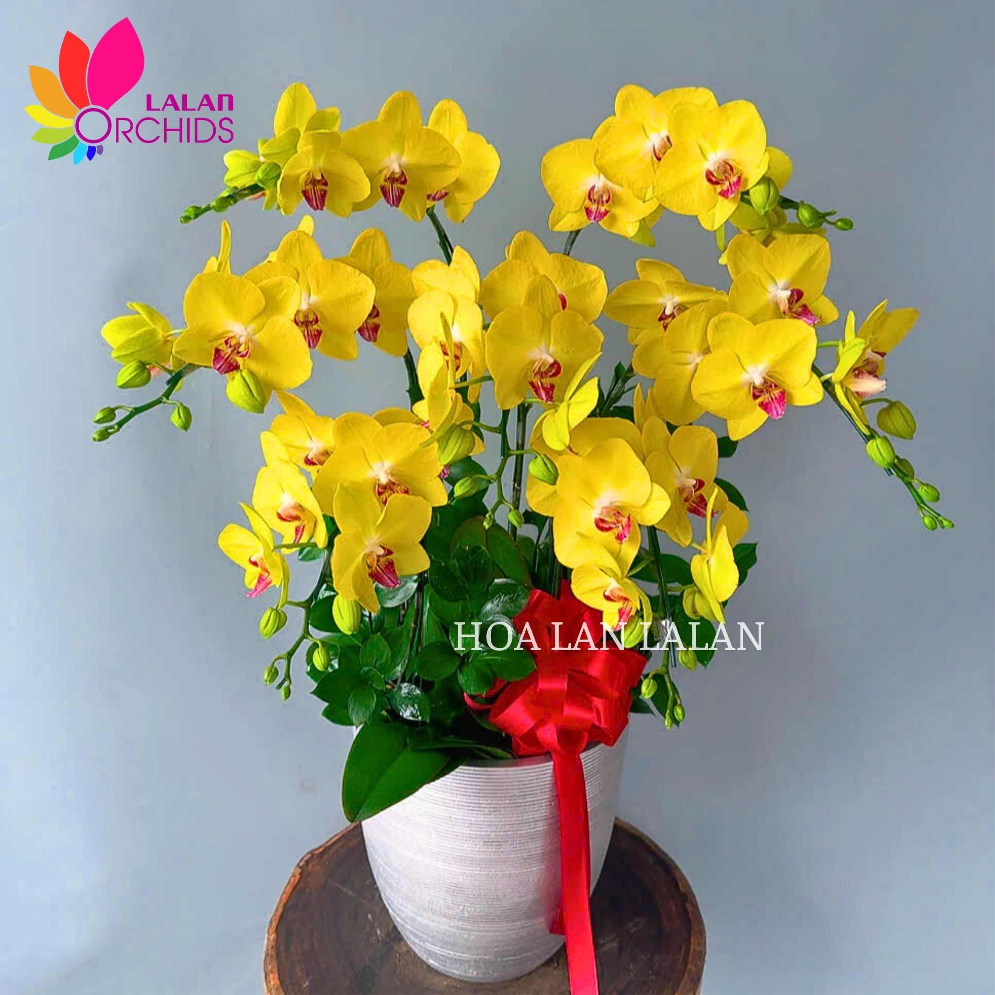 Chậu hoa lan hồ điệp vàng tươi 7 cành toát lên vẻ đẹp thanh thoát, cao quý. Từng bông lan hồ điệp to đều, vàng rực rỡ, kiêu sa làm sáng rực không gian trưng bày. Chậu hoa lan hồ điệp được thiết kế gọn gàng, phù hợp với nhiều không gian từ phòng khách, văn phòng đến phòng làm việc. Sự kết hợp hoàn hảo giữa màu vàng của hoa lan, kiểu dáng và chậu tế tạo thành điểm nhấn nổi bật cho mọi không gian.