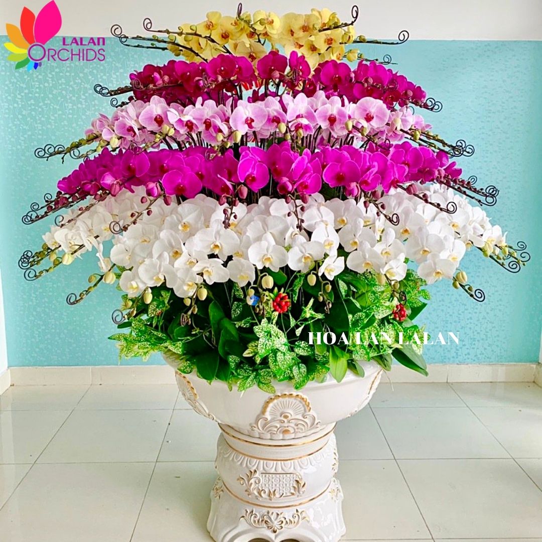 Chậu lan hồ điệp chưng đại sảnh được ghép từ 100 cành lan hồ điệp màu trắng, tím, hồng và vàng. Được các nghệ nhân ghép một cách tỉ mĩ và nghệ thuật, tạo nên chậu hoa Lan hồ điệp đẹp sang trọng, đẳng cấp và tinh tế.