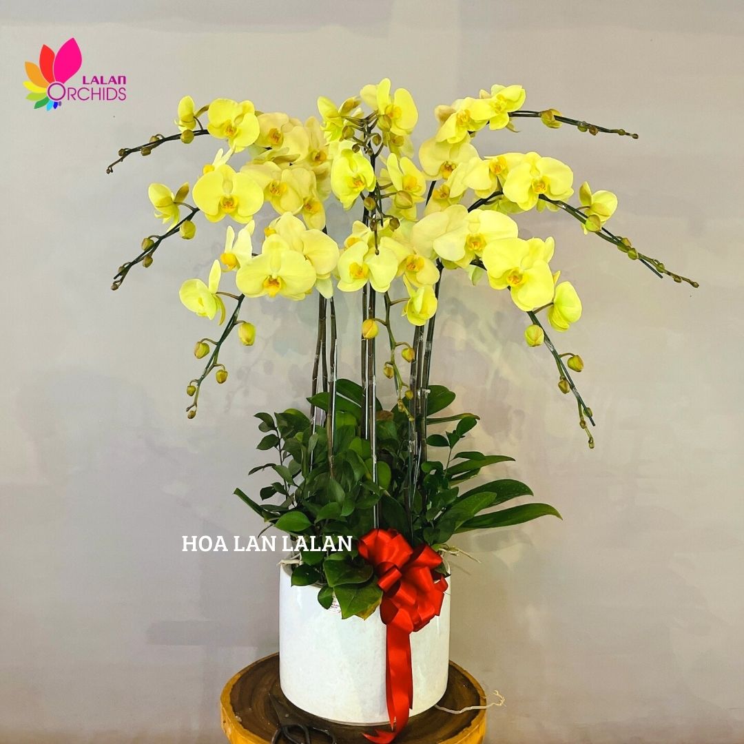 Chậu lan hồ điệp 9 cành màu xanh táo ghép từ những cành hoa lan hồ điệp chất lượng loại A với đặc điểm bông to, cành dài, siêu bền, được các nghệ nhân của Hoa lan Lalan ghép xen kẽ một cách hài hòa, nghệ thuật tạo nên chậu hoa lan đẹp sang trọng, quý phái và tinh tế.