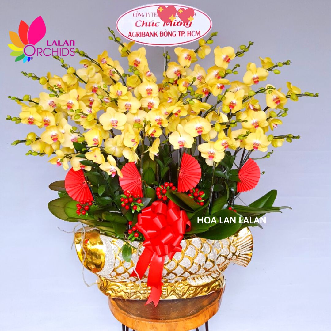 Chậu lan hồ điệp cá chép vàng có nghĩa về phong thủy “Cá chép vượt vũ môn hóa Rồng”, mang lại may mắn, tài lộc cho người sở hữu.