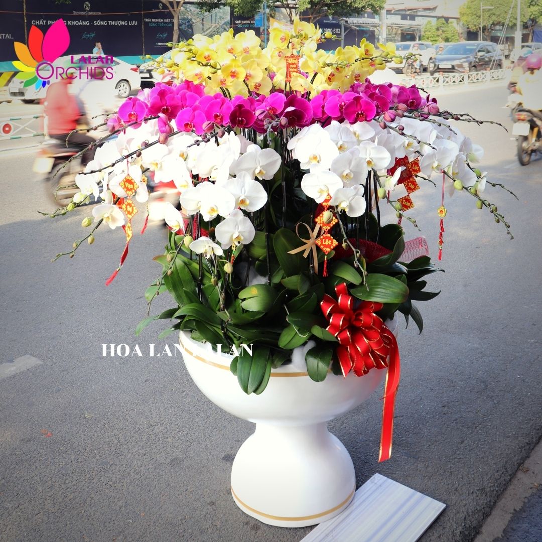 Lan hồ điệp đa sắc 39 cành kết hợp từ bốn màu lan trắng, tím, vàng, được những nghệ nhân của Hoa lan Lalan thiết kế một cách tỉ mỉ và nghệ thuật, tạo nên chậu hoa lan hồ điệp sang trọng, quyến rũ và tinh tế.