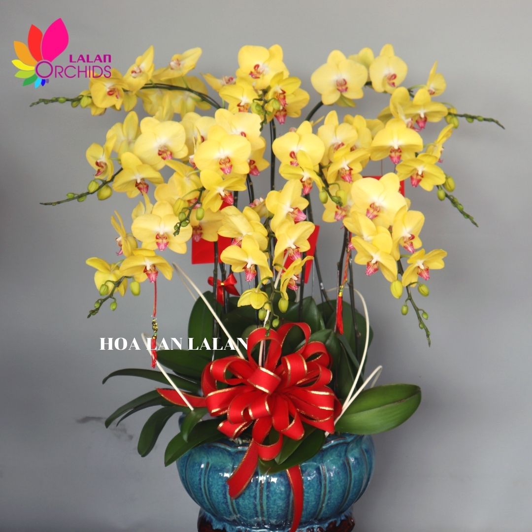 Chậu lan hồ điệp màu vàng rất thích hợp dùng để tặng khai trương, sinh nhật, làm quà tặng hoặc trang trí văn phòng.