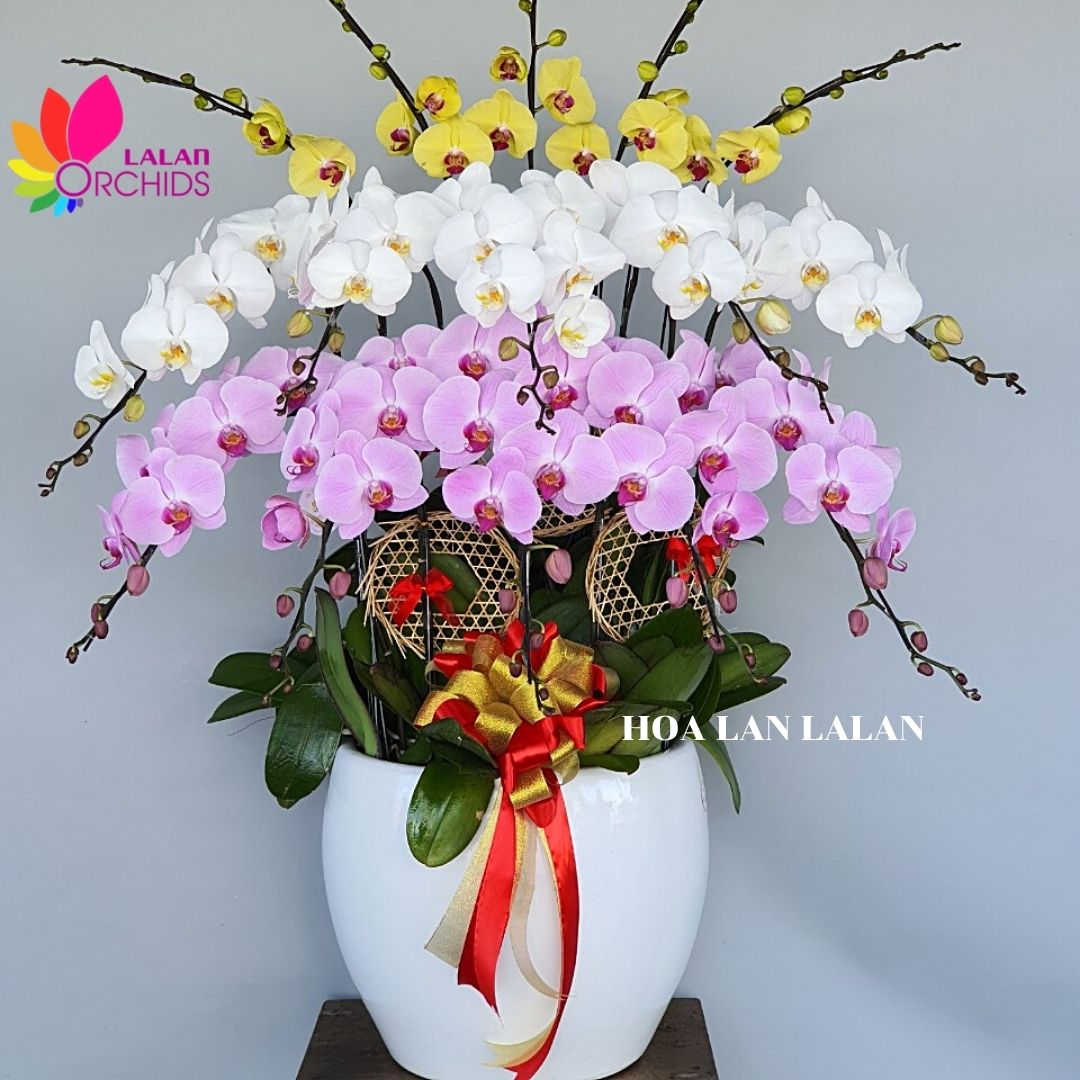 Chậu lan hồ điệp kỷ niệm ngày cưới ghép từ 15 cành lan hồ điệp hồng, trắng, vàng.