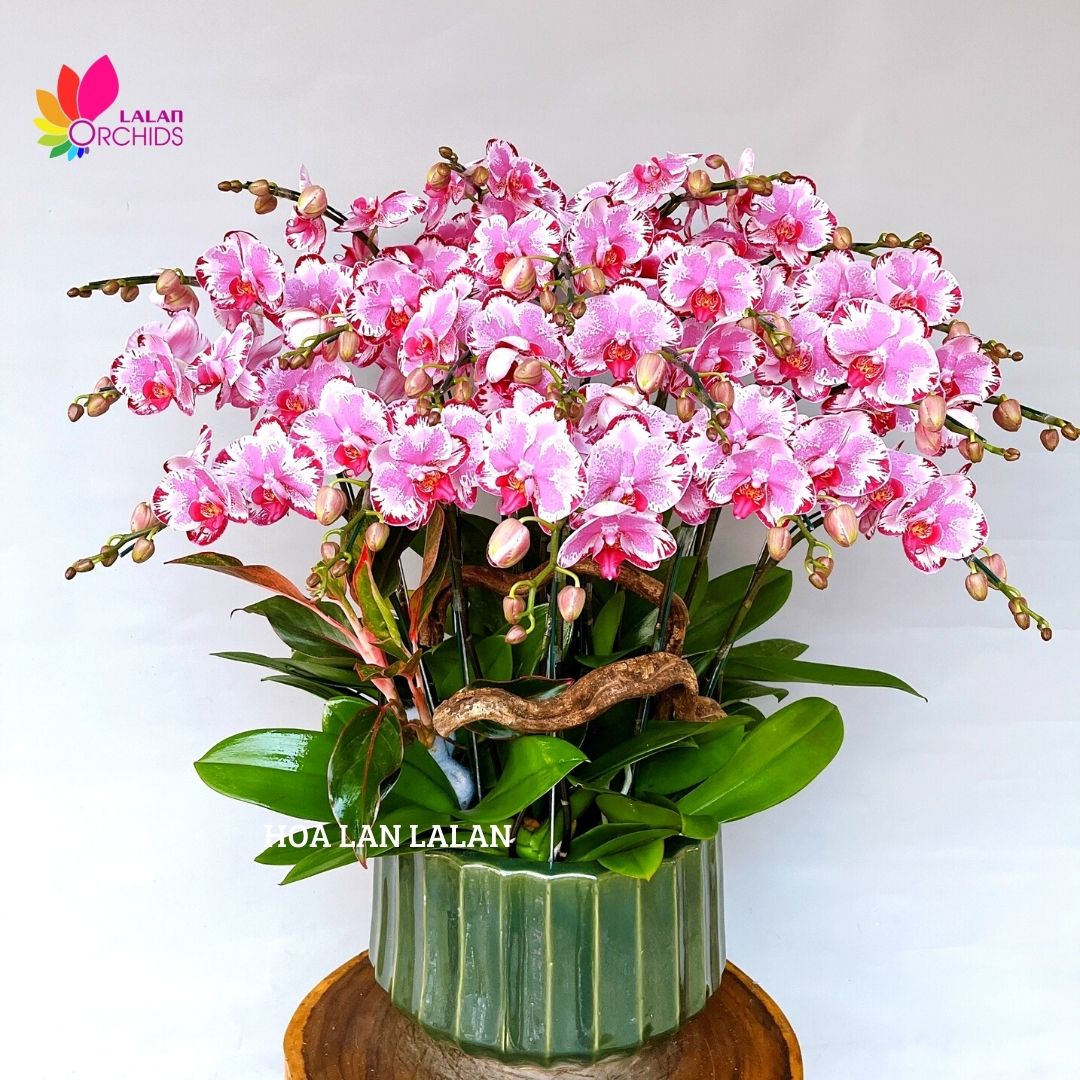 Chậu lan hồ điệp màu hồng đột biến 10 cây (2 vòi) ghép từ những cành hoa lan hồ điệp chất lượng loại A với đặc điểm bông to, cành dài, siêu bền, được các nghệ nhân của Hoa lan Lalan ghép xen kẽ một cách hài hòa, nghệ thuật tạo nên chậu hoa lan đẹp sang trọng, quý phái và tinh tế.