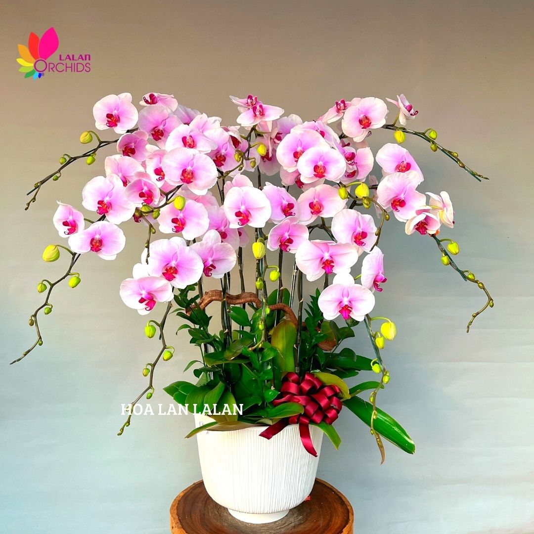 Chậu lan hồ điệp màu hồng phấn 10 cành ghép từ những cành hoa lan hồ điệp chất lượng loại A với đặc điểm bông to, cành dài, siêu bền, được các nghệ nhân của Hoa lan Lalan ghép xen kẽ một cách hài hòa, nghệ thuật tạo nên chậu hoa lan đẹp sang trọng, quý phái và tinh tế.