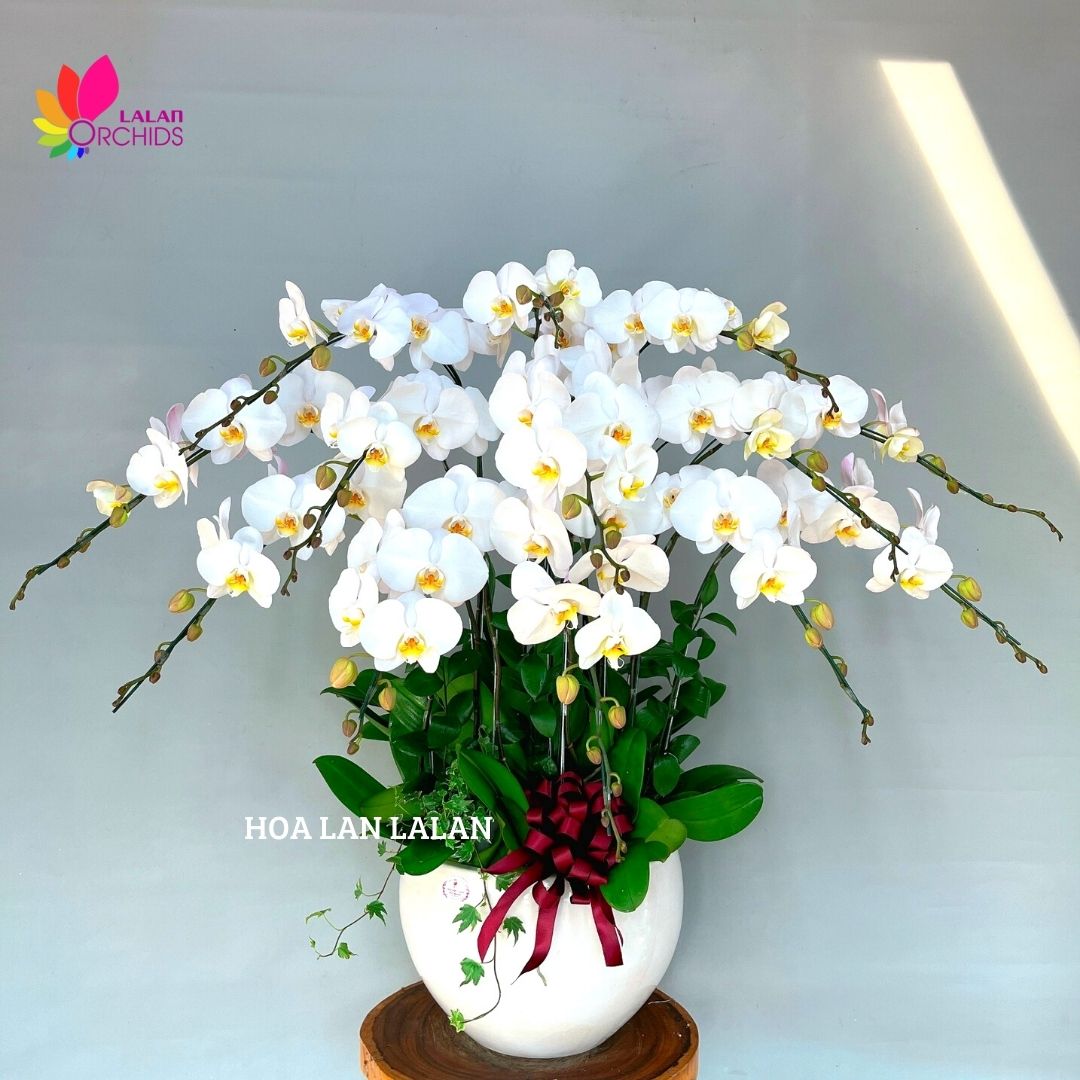 Chậu lan hồ điệp màu trắng 13 cành ghép từ những cành hoa lan hồ điệp chất lượng loại A với đặc điểm bông to, cành dài, siêu bền, được các nghệ nhân của Hoa lan Lalan ghép xen kẽ một cách hài hòa, nghệ thuật tạo nên chậu hoa lan đẹp sang trọng, quý phái và tinh tế.
