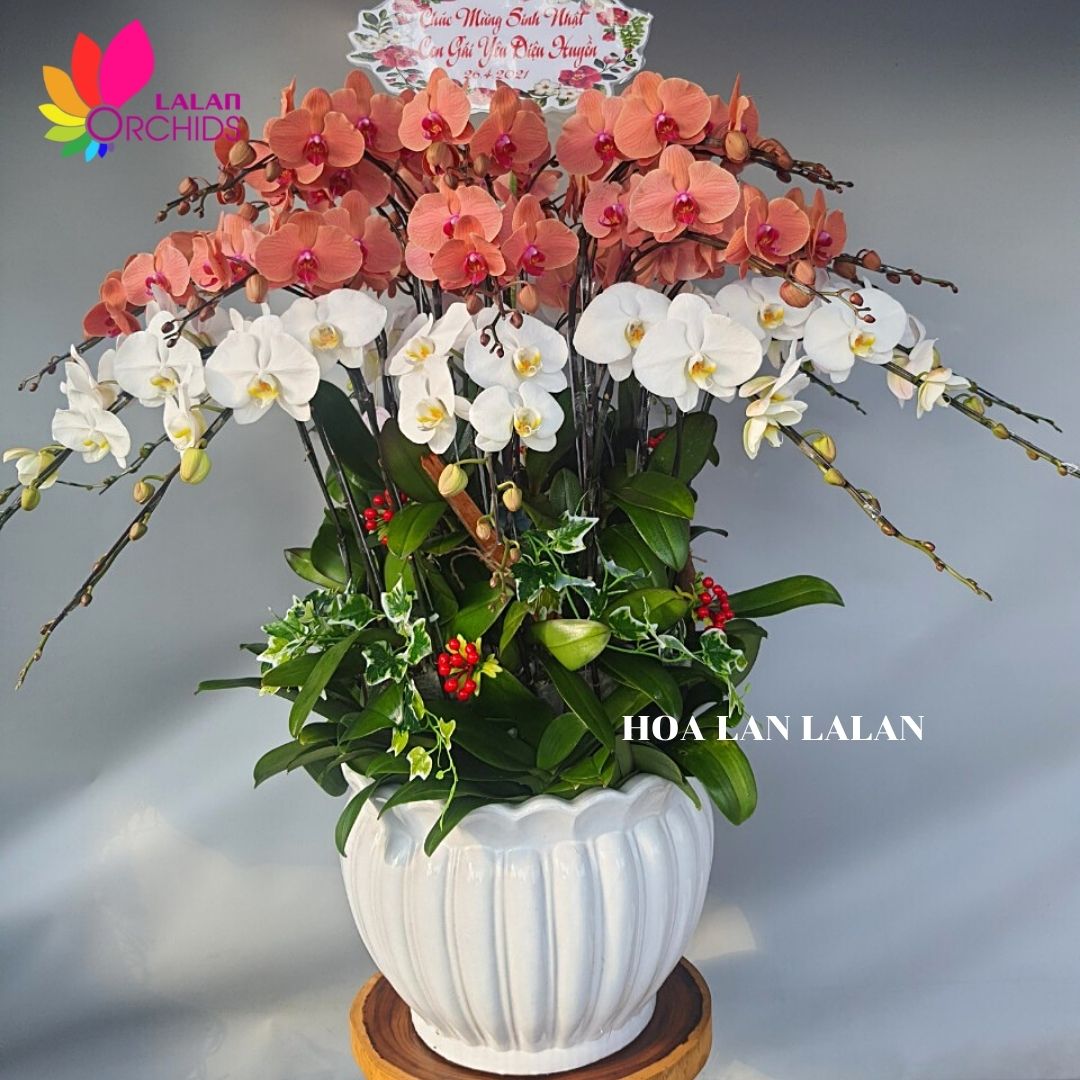 Chậu lan hồ điệp màu trắng, cam 30 cành được những người thợ có tay nghề cao của Hoa lan Lalan thiết kế một cách tỉ mỉ và nghệ thuật, tạo nên chậu hoa lan hồ điệp sang trọng, quyến rũ và tinh tế.