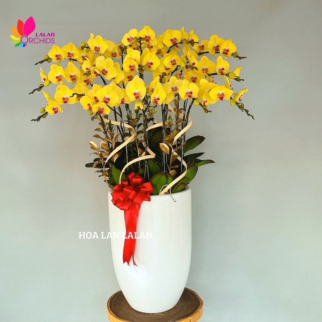 Chậu lan hồ điệp màu vàng đẹp và sang trọng ghép từ những cành hoa lan hồ điệp chất lượng loại A với đặc điểm bông to, cành dài, siêu bền, được các nghệ nhân của Hoa lan Lalan ghép xen kẽ một cách hài hòa, nghệ thuật tạo nên chậu hoa lan đẹp sang trọng, quý phái và tinh tế.