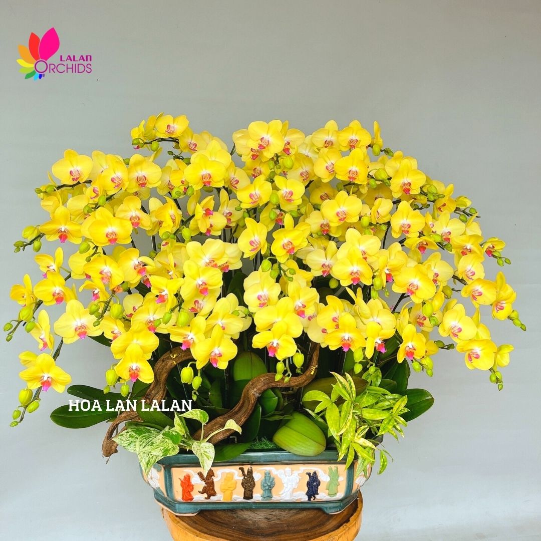 Chậu lan hồ điệp 30 cành vàng đẹp sang trọng ghép từ những cành hoa lan hồ điệp chất lượng loại A với đặc điểm bông to, cành dài, siêu bền, được các nghệ nhân của Hoa lan Lalan ghép xen kẽ một cách hài hòa, nghệ thuật tạo nên chậu hoa lan đẹp sang trọng, quý phái và tinh tế.