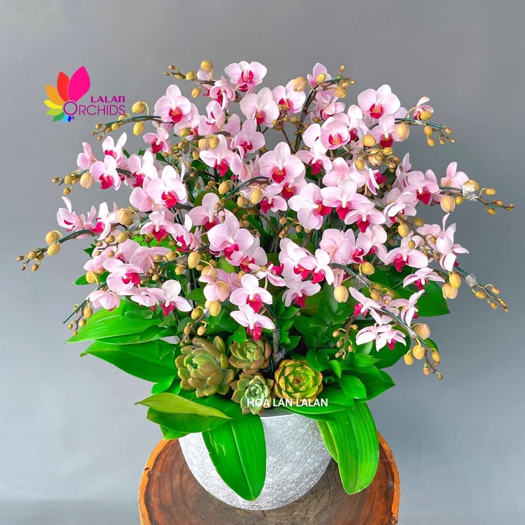 Chậu lan hồ điệp mini hồng phấn được ghép từ 10 cây lan mini loại 2 vòi có mix cây sen đá, tạo thành chậu lan sum xuê với 20 cành bông nhỏ xinh, đẹp và sang trọng.