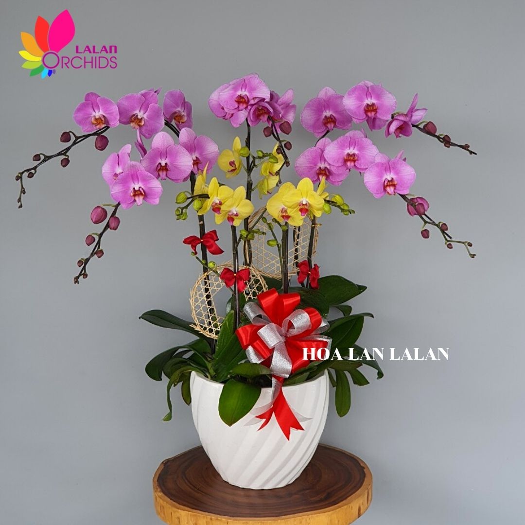 Chậu lan hồ điệp mừng sinh nhật người yêu được các nghệ nhân của Hoa lan Lalan cắm xen kẽ một cách hài hòa mang lại một vẻ đẹp khó tả.