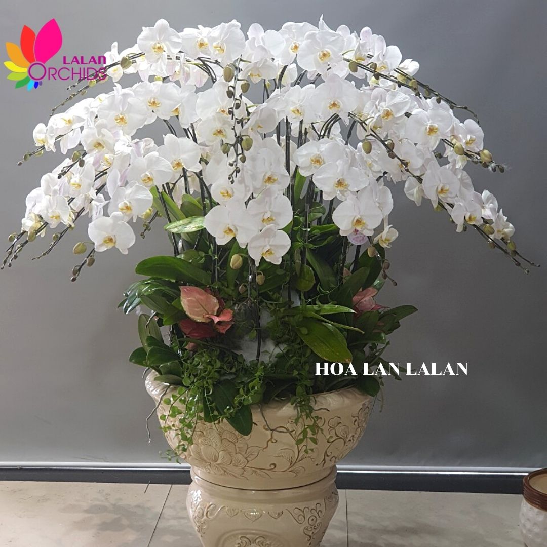 Chậu lan hồ điệp trắng phú quý ghép từ 30 cành lan hồ điệp màu trắng cùng với chậu sứ cao cấp, được kết hợp một cách hài hòa tạo nên chậu lan đẹp khó cưỡng.