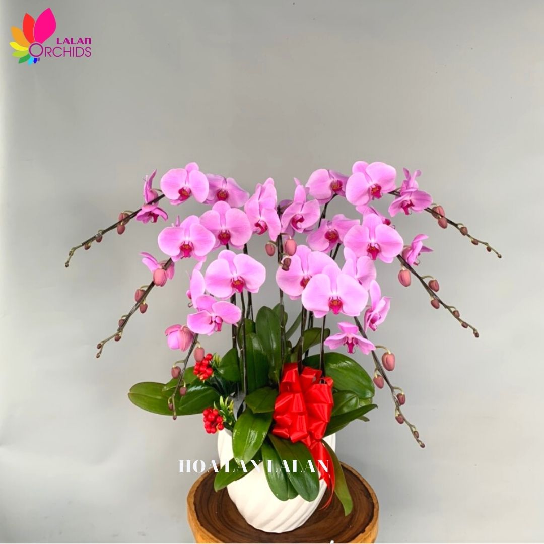 Chậu hoa lan hồ điệp 7 cành màu hồng tinh tế ghép từ những cành hoa lan hồ điệp chất lượng loại A với đặc điểm bông to, cành dài, siêu bền, được các nghệ nhân của Hoa lan Lalan ghép xen kẽ một cách hài hòa, nghệ thuật tạo nên chậu hoa lan đẹp sang trọng, quý phái và tinh tế.
