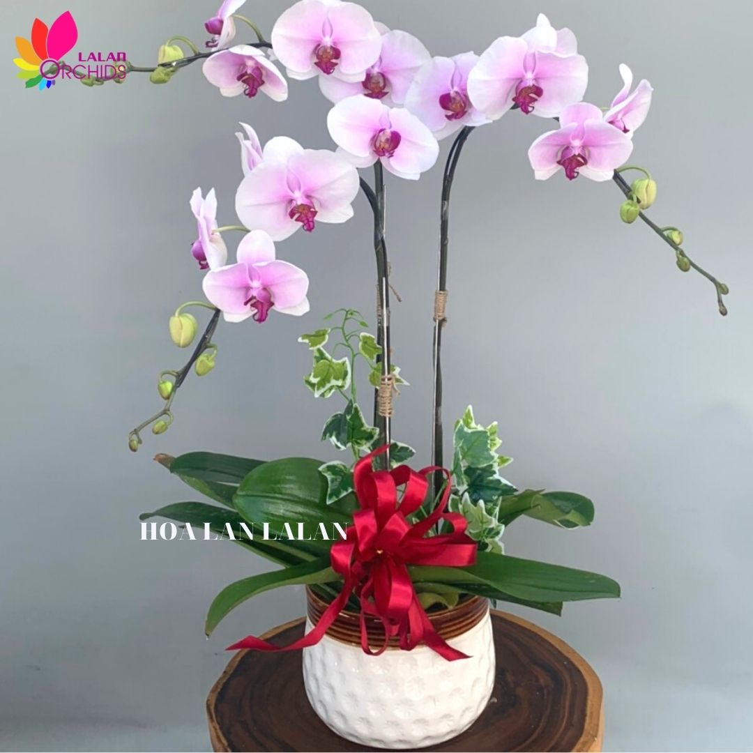 Chậu hoa lan hồ điệp màu hồng 3 cành tặng sinh nhật ghép từ những cành hoa lan hồ điệp chất lượng loại A với đặc điểm bông to, cành dài, siêu bền, được các nghệ nhân của Hoa lan Lalan ghép xen kẽ một cách hài hòa, nghệ thuật tạo nên chậu hoa lan đẹp sang trọng, quý phái và tinh tế.