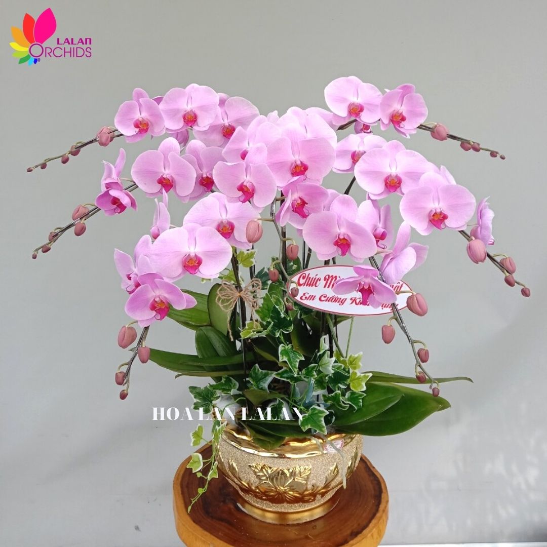 Chậu hoa lan hồ điệp màu hồng 7 cành ghép từ những cành hoa lan hồ điệp chất lượng loại A với đặc điểm bông to, cành dài, siêu bền, được các nghệ nhân của Hoa lan Lalan ghép xen kẽ một cách hài hòa, nghệ thuật tạo nên chậu hoa lan đẹp sang trọng, quý phái và tinh tế.