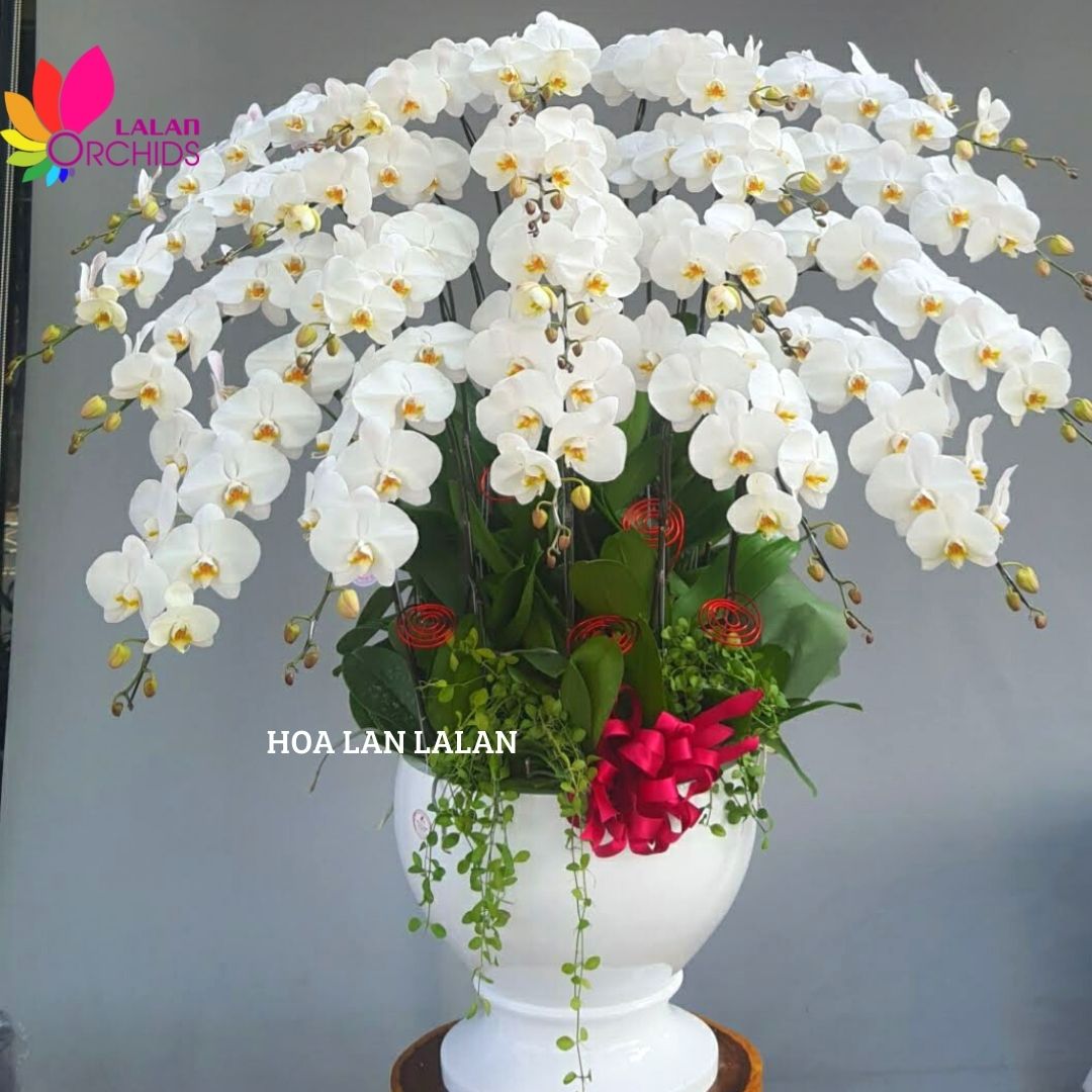 Hoa lan hồ điệp màu trắng 20 cành ghép từ những cành hoa lan chất lượng loại A với đặc điểm bông to, cành dài, siêu bền, được các nghệ nhân của Hoa lan Lalan ghép xen kẽ một cách hài hòa, nghệ thuật tạo nên chậu hoa lan đẹp sang trọng, quý phái và tinh tế.