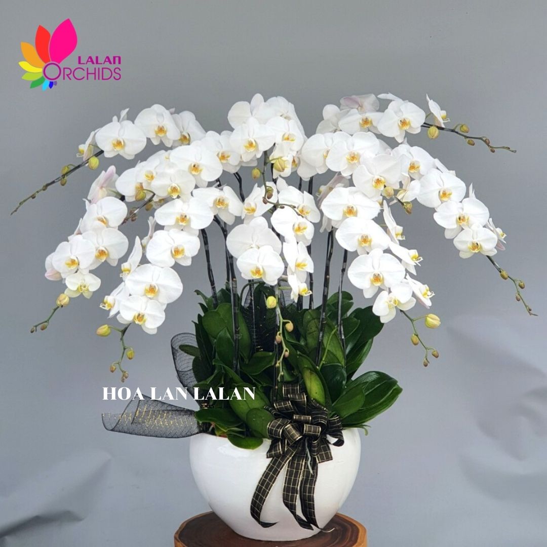 Lan hồ điệp màu trắng chia buồn được kết hợp từ 10 cành lan cùng với chậu sứ và nơ trang trí, được những người thợ có tay nghề cao của Hoa lan Lalan thiết kế một cách tỉ mỉ.