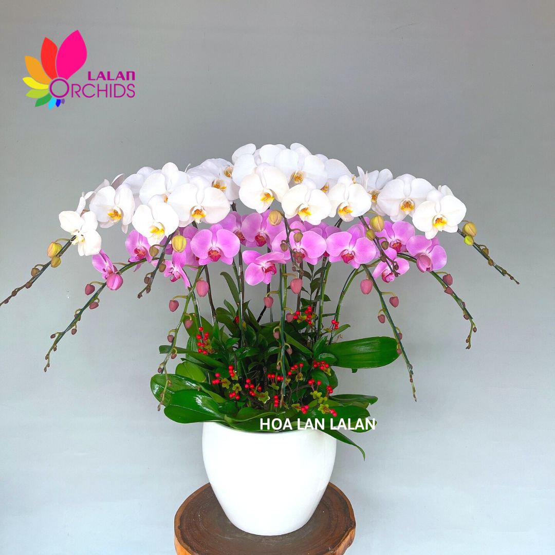 Lan hồ điệp hồng, trắng 10 cành được kết hợp từ 5 cành lan hồ điệp màu hồng, 5 cành lan hồ điệp màu trắng, được những người thợ có tay nghề cao của Hoa lan Lalan thiết kế một cách tỉ mỉ và nghệ thuật, tạo nên chậu hoa lan hồ điệp sang trọng, quyến rũ và tinh tế.