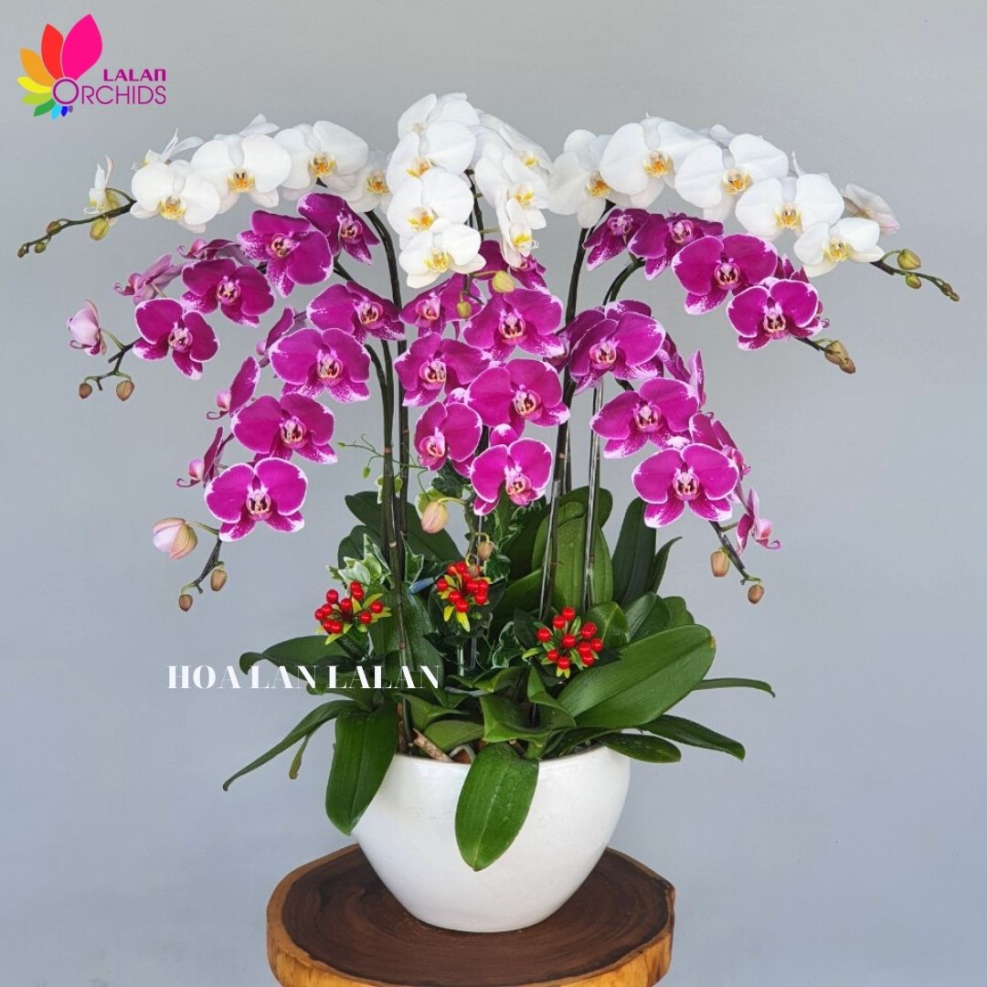 Chậu hoa lan hồ điệp màu trắng tím 8 cành ghép từ những cành hoa lan chất lượng loại A với đặc điểm bông to, cành dài, siêu bền, được các nghệ nhân của Hoa lan Lalan ghép xen kẽ một cách hài hòa, nghệ thuật tạo nên chậu hoa lan đẹp sang trọng, quý phái và tinh tế.
