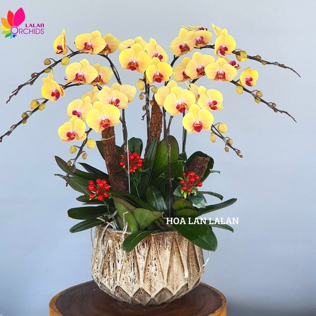 Hoa lan hồ điệp màu vàng 7 cành ghép từ những cành hoa lan chất lượng loại A với đặc điểm bông to, cành dài, siêu bền, được các nghệ nhân của Hoa lan Lalan ghép xen kẽ một cách hài hòa, nghệ thuật tạo nên chậu hoa lan đẹp sang trọng, quý phái và tinh tế.