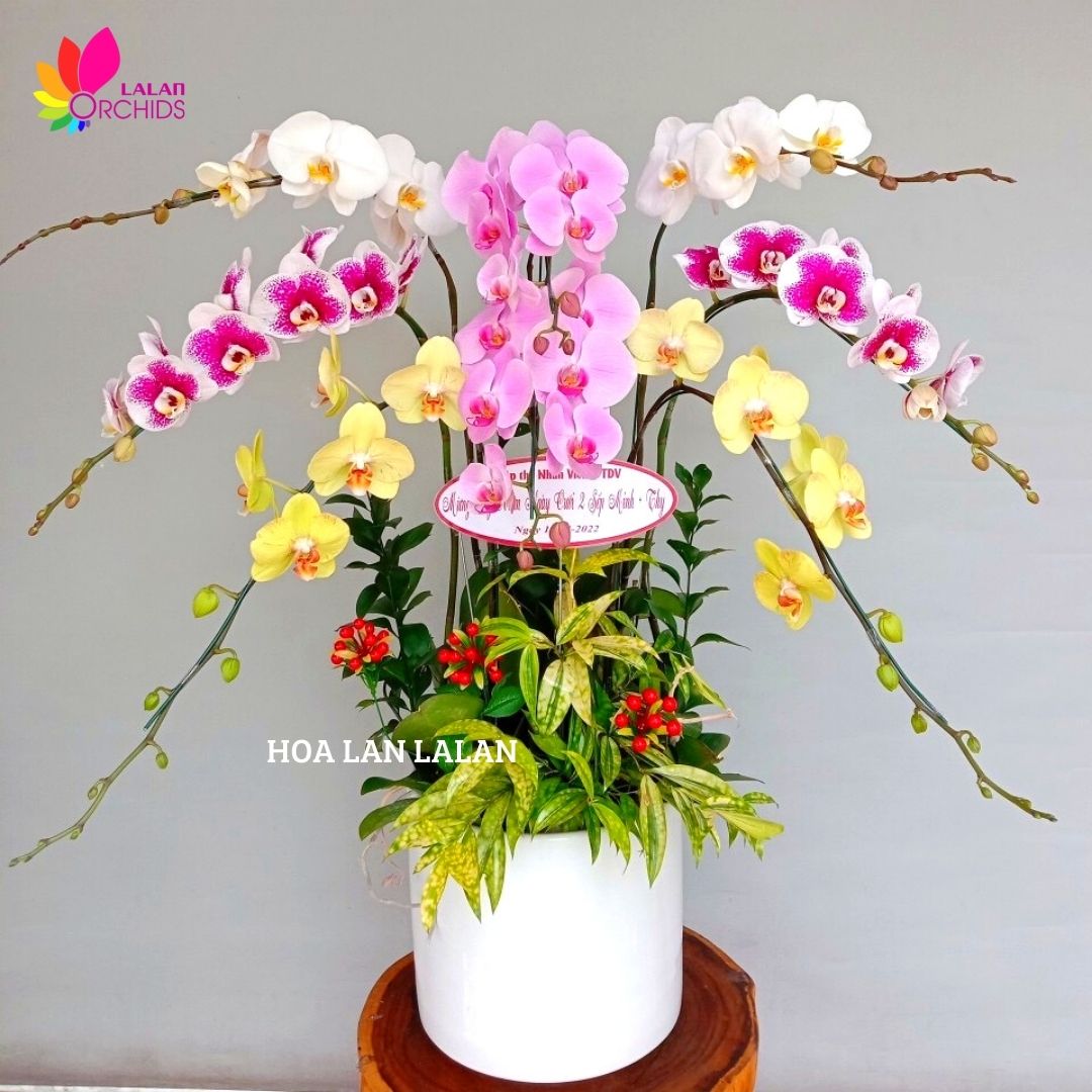 Chậu hoa lan hồ điệp tặng sinh nhật được ghép từ 8 cành lan đa sắc màu do các nghệ nhân của Hoa lan Lalan ghép xen kẽ một cách hài hòa, nghệ thuật tạo nên chậu hoa lan đẹp sang trọng, quý phái và tinh tế.