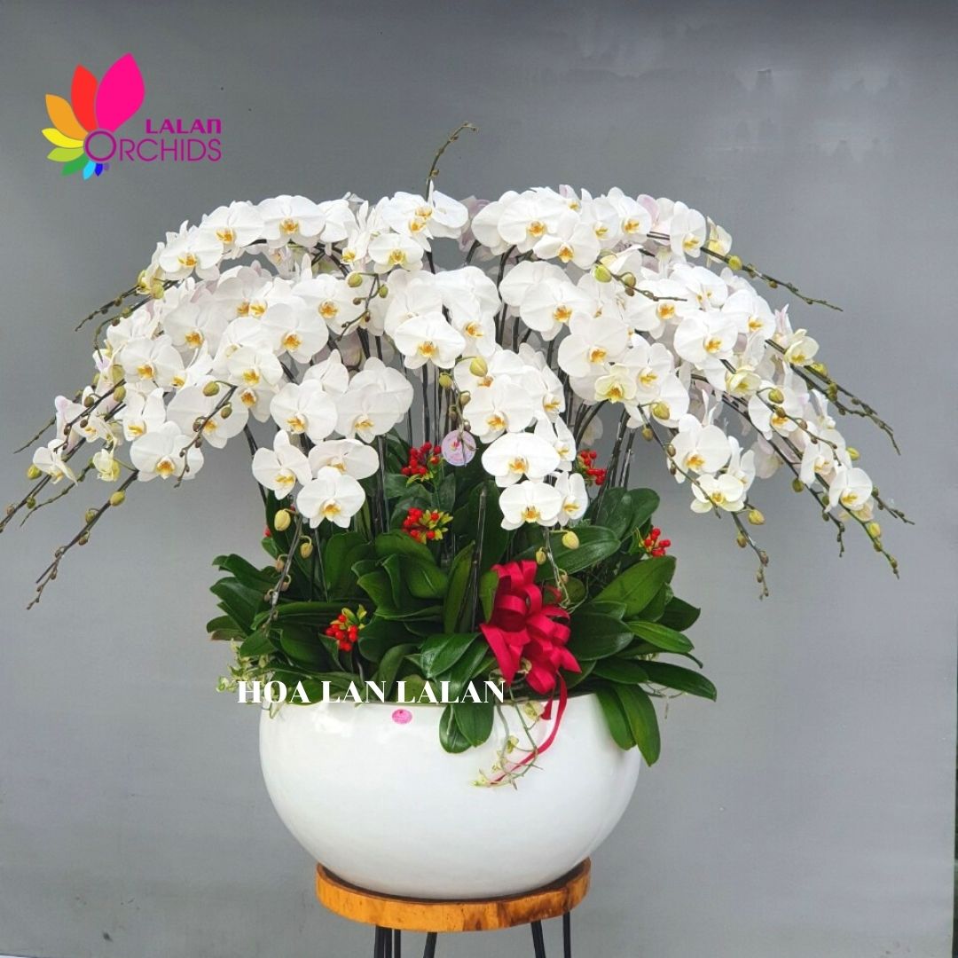 Lan hồ điệp màu trắng 36 cành được kết hợp từ 36 cành lan cùng với chậu composite và nơ trang trí, được những người thợ có tay nghề cao của Hoa lan Lalan thiết kế một cách tỉ mỉ và nghệ thuật, tạo nên chậu lan hồ điệp sang trọng, quyến rũ và tinh tế.