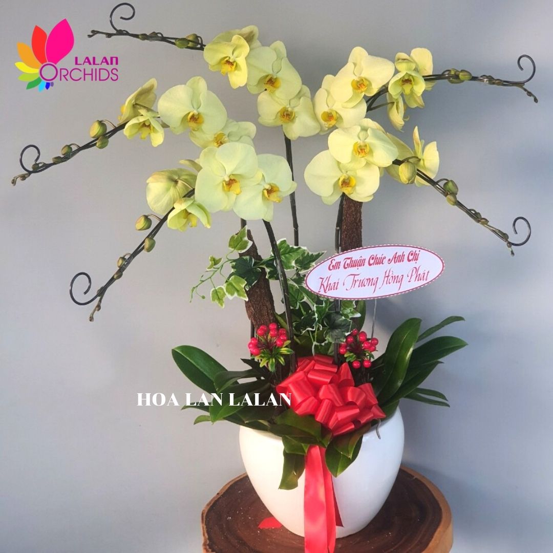 Chậu lan hồ điệp màu vàng để bàn được kết hợp từ 5 gốc lan hồ điệp vàng, được những người thợ có tay nghề cao của Hoa lan Lalan thiết kế một cách tỉ mỉ và nghệ thuật, tạo nên chậu lan hồ điệp sang trọng, quyến rũ và tinh tế.
