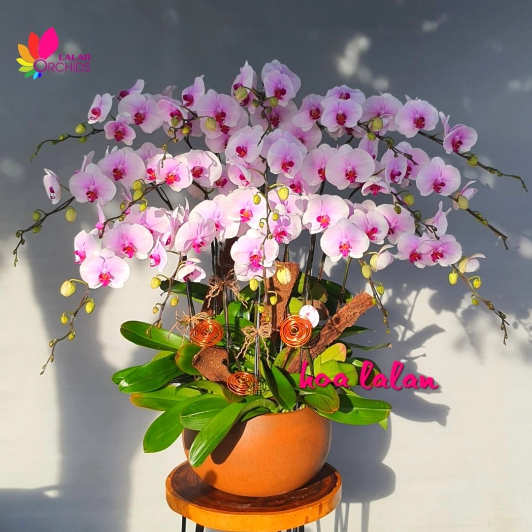Lan hồ điệp 15 cành màu hồng phấn ghép từ những cành hoa lan chất lượng loại A với đặc điểm bông to, cành dài, siêu bền, được các nghệ nhân của Hoa lan Lalan ghép xen kẽ một cách hài hòa, nghệ thuật tạo nên chậu hoa lan đẹp sang trọng, quý phái và tinh tế.