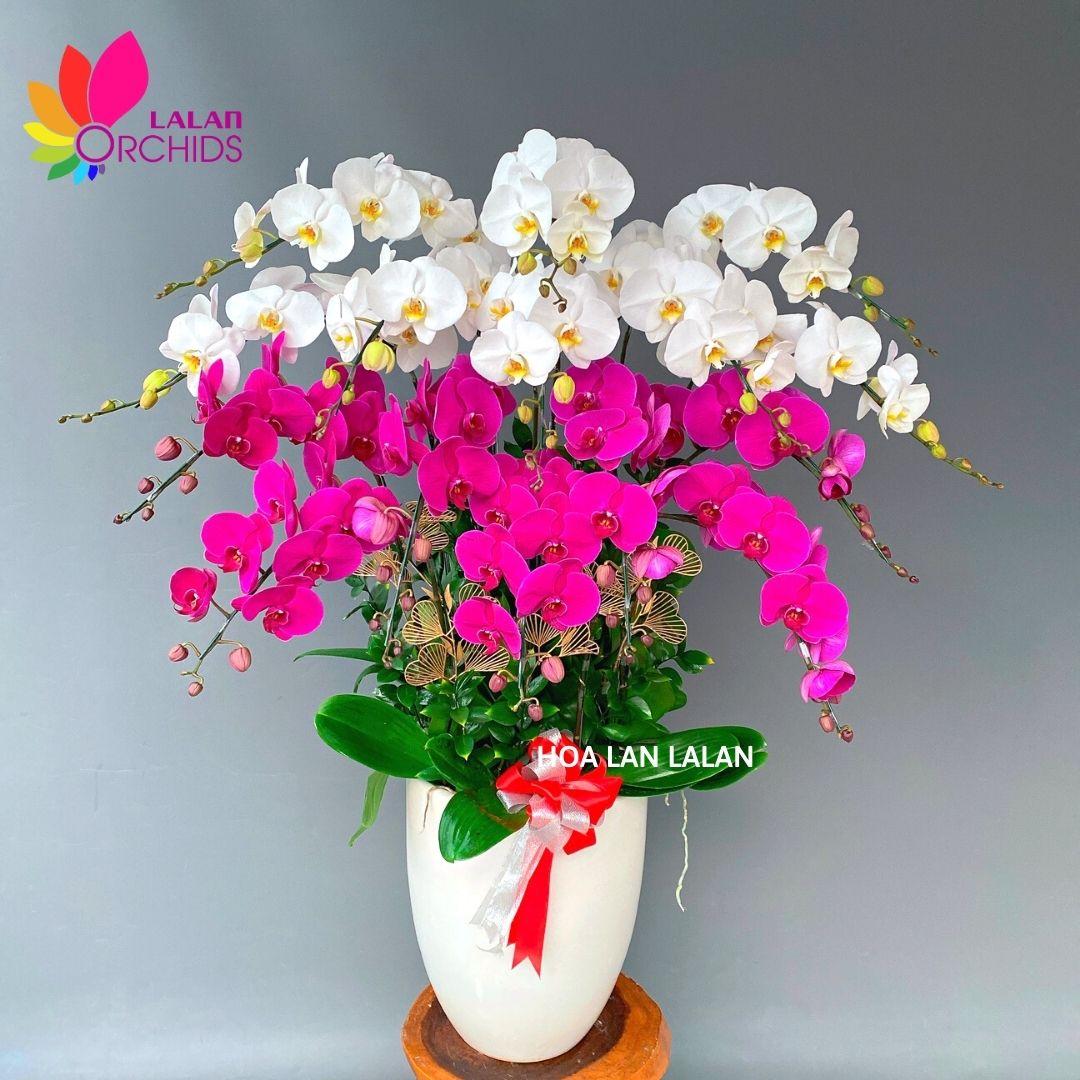 Lan hồ điệpt trắng tím được các nghệ nhân của Hoa lan Lalan ghép từ 15 cành lan hồ điệp màu trắng và tím, theo nghệ thuật ghép một hướng xen kẻ, hài hòa tạo nên tác phẩm vô cùng đẹp và sang trọng.